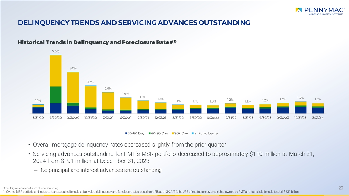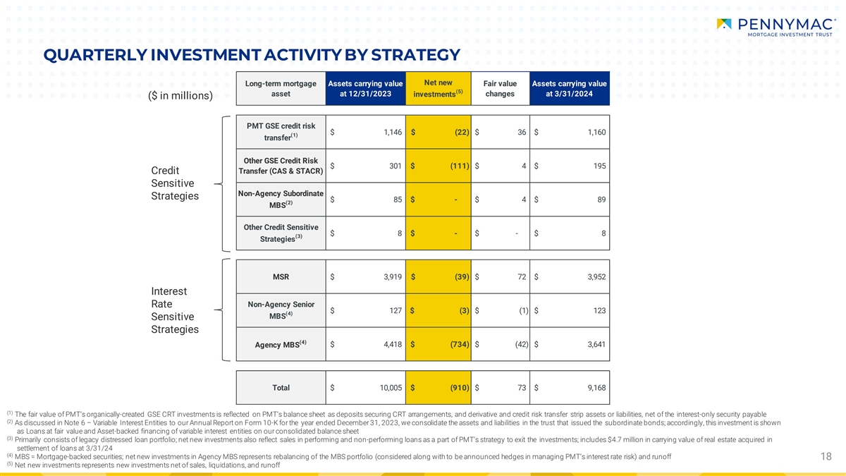 QUARTERLY INVESTMENT ACTIVITY BY STRATEGY Net new Long-term mortgage Assets carrying value Fair value Assets carrying value (5) asset at 12/31/2023 investments changes at 3/31/2024 ($ in millions) PMT GSE credit risk $ 1,146 $ (22) $ 36 $ 1,160 (1) transfer Other GSE Credit Risk $ 301 $ (111) $ 4 $ 195 Transfer (CAS & STACR) Credit Sensitive Non-Agency Subordinate Strategies $ 85 $ - $ 4 $ 89 (2) MBS Other Credit Sensitive $ 8 $ - $ - $ 8 (3) Strategies MSR $ 3,919 $ (39) $ 72 $ 3,952 Interest Rate Non-Agency Senior $ 127 $ (3) $ (1) $ 1 23 (4) MBS Sensitive Strategies (4) Agency MBS $ 4,418 $ (734) $ (42) $ 3,641 Total $ 10,005 $ (910) $ 7 3 $ 9,168 (1) The fair value of PMT’s organically-created GSE CRT investments is reflected on PMT’s balance sheet as deposits securing CRT arrangements, and derivative and credit risk transfer strip assets or liabilities, net of the interest-only security payable (2) As discussed in Note 6 – Variable Interest Entities to our Annual Report on Form 10-K for the year ended December 31, 2023, we consolidate the assets and liabilities in the trust that issued the subordinate bonds; accordingly, this investment is shown as Loans at fair value and Asset-backed financing of variable interest entities on our consolidated balance sheet (3) Primarily consists of legacy distressed loan portfolio; net new investments also reflect sales in performing and non-performing loans as a part of PMT’s strategy to exit the investments; includes $4.7 million in carrying value of real estate acquired in settlement of loans at 3/31/24 (4) MBS = Mortgage-backed securities; net new investments in Agency MBS represents rebalancing of the MBS portfolio (considered along with to be announced hedges in managing PMT’s interest rate risk) and runoff 18 (5) Net new investments represents new investments net of sales, liquidations, and runoff
