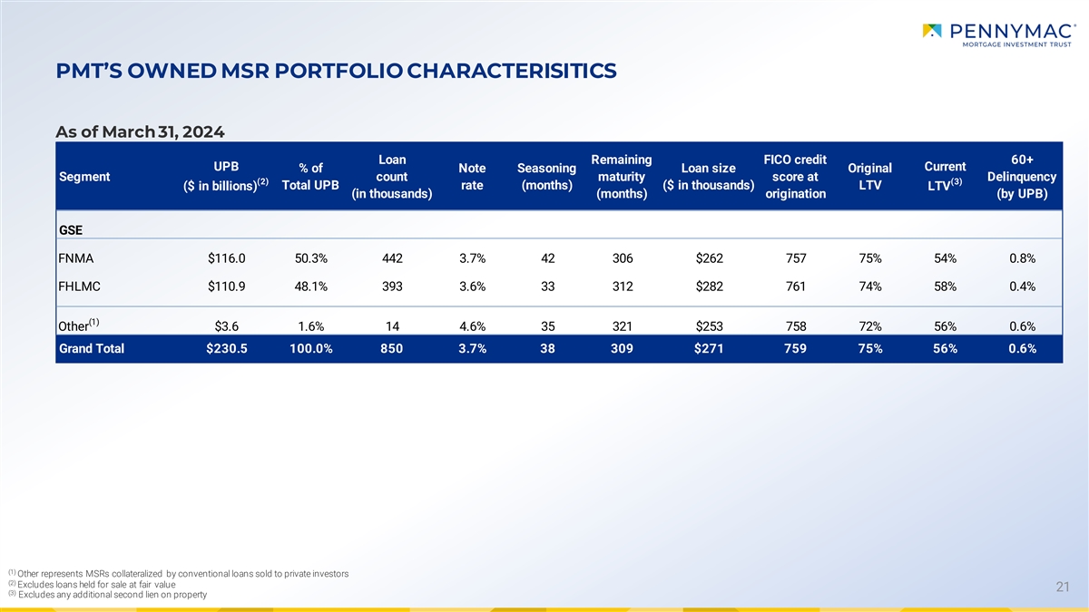 DELINQUENCY TRENDS AND SERVICING ADVANCES OUTSTANDING (1) Historical Trends in Delinquency and Foreclosure Rates 7.0% 5.0% 3.3% 2.6% 1.9% 1.5% 1.4% 1.3% 1.3% 1.3% 1.2% 1.2% 1.1% 1.1% 1.1% 1.0% 1.1% 3/31/20 6/30/20 9/30/20 12/31/20 3/31/21 6/30/21 9/30/21 12/31/21 3/31/22 6/30/22 9/30/22 12/31/22 3/31/23 6/30/23 9/30/23 12/31/23 3/31/24 30-60 Day 60-90 Day 90+ Day In Foreclosure • Overall mortgage delinquency rates decreased slightly from the prior quarter • Servicing advances outstanding for PMT’s MSR portfolio decreased to approximately $110 million at March 31, 2024 from $191 million at December 31, 2023 ‒ No principal and interest advances are outstanding Note: Figures may not sum due to rounding 20 (1) Owned MSR portfolio and includes loans acquired for sale at fair value; delinquency and foreclosure rates based on UPB; as of 3/31/24, the UPB of mortgage servicing rights owned by PMT and loans held for sale totaled $231 billion