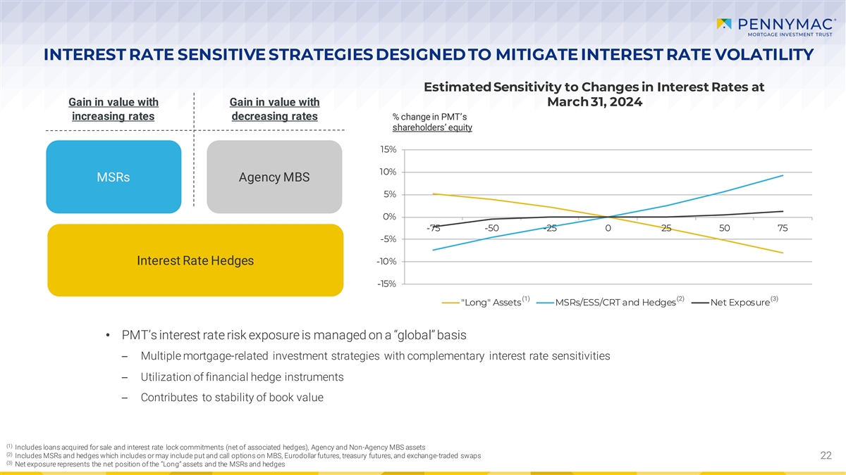 PMT’S OWNED MSR PORTFOLIO CHARACTERISITICS As of March 31, 2024 Loan Remaining FICO credit 60+ UPB Current % of Note Seasoning Loan size Original Segment count maturity score at Delinquency (2) (3) Total UPB rate (months) ($ in thousands) LTV ($ in billions) LTV (in thousands) (months) origination (by UPB) GSE FNMA $116.0 50.3% 442 3.7% 42 306 $262 757 75% 54% 0.8% FHLMC $110.9 48.1% 393 3.6% 33 312 $282 761 74% 58% 0.4% (1) Other $3.6 1.6% 14 4.6% 35 321 $253 758 72% 56% 0.6% Grand Total $230.5 100.0% 850 3.7% 38 309 $271 759 75% 56% 0.6% (1) Other represents MSRs collateralized by conventional loans sold to private investors (2) Excludes loans held for sale at fair value 21 (3) Excludes any additional second lien on property