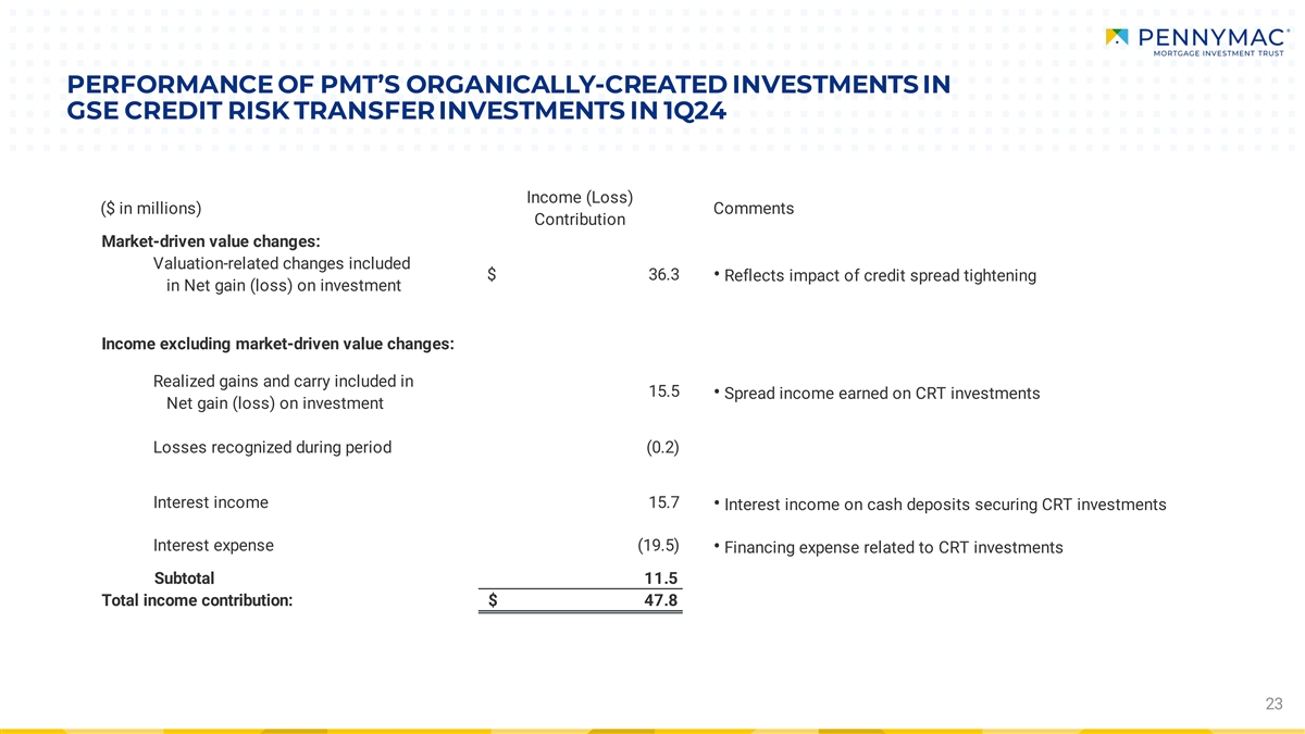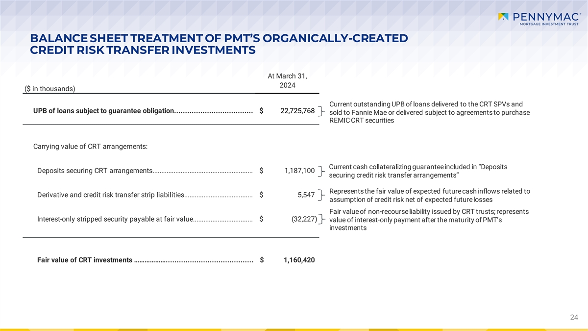 PERFORMANCE OF PMT’S ORGANICALLY-CREATED INVESTMENTS IN GSE CREDIT RISK TRANSFER INVESTMENTS IN 1Q24 Income (Loss) ($ in millions) Comments Contribution Market-driven value changes: Valuation-related changes included $ 36.3 • Reflects impact of credit spread tightening in Net gain (loss) on investment Income excluding market-driven value changes: Realized gains and carry included in 15.5 • Spread income earned on CRT investments Net gain (loss) on investment Losses recognized during period (0.2) Interest income 15.7 • Interest income on cash deposits securing CRT investments Interest expense (19.5) • Financing expense related to CRT investments Subtotal 11.5 Total income contribution: $ 47.8 23