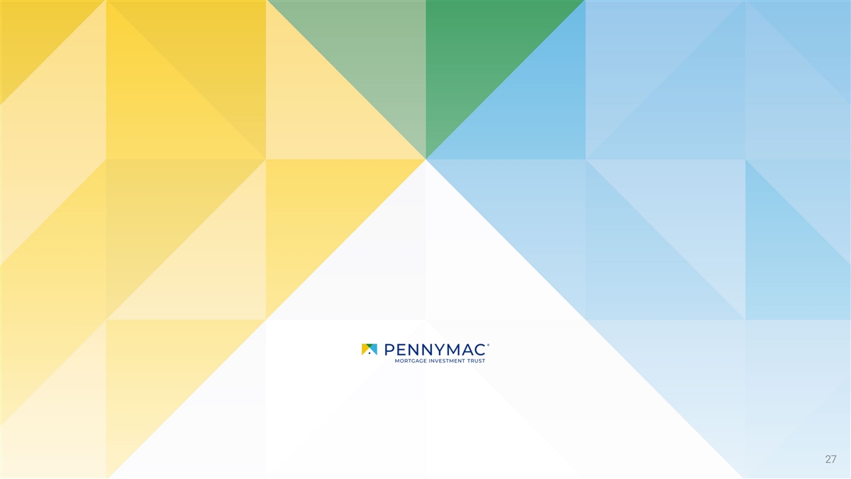 CORRESPONDENT PRODUCTION ACQUISITIONS AND LOCKS BY PRODUCT Unaudited ($ in millions) 1Q23 2Q23 3Q23 4Q23 1Q24 Correspondent Acquisitions Conventional Conforming - for PMT $ 6,629 $ 3,029 $ 2,759 $ 2 ,477 $ 1,769 (1) Conventional Conforming - for PFSI 4,063 7 ,018 9, 933 10 ,129 8 ,190 (1) Government - for PFSI 9,461 11,139 8,848 11, 011 8,167 Jumbo - for PMT - - 1 3 3 Total $ 2 0,153 $ 21,186 $ 21,541 $ 23 ,620 $ 18,128 Correspondent Locks Conventional Conforming - for PMT $ 7 ,588 $ 3,322 $ 3,493 $ 2,737 $ 2 ,472 (1) Conventional Conforming - for PFSI 3,781 7 ,523 10,333 9,977 8 ,614 (1) Government - for PFSI 1 0,341 10,735 1 0,063 11,197 8 ,467 Jumbo - for PMT - - 2 5 10 Total $ 21,709 $ 21,581 $ 23,891 $ 23,916 $ 19,563 Note: Figures may not sum due to rounding (1) PMT sells government-insured and guaranteed loans, and certain conventional loans that it purchases from correspondent sellers to PennyMac Loan Services, LLC, and earns a sourcing fee and interest income for its holding period; PMT does not 26 pay a fulfillment fee for government-insured or guaranteed loans or conventional loans subsequently sold to PFSI