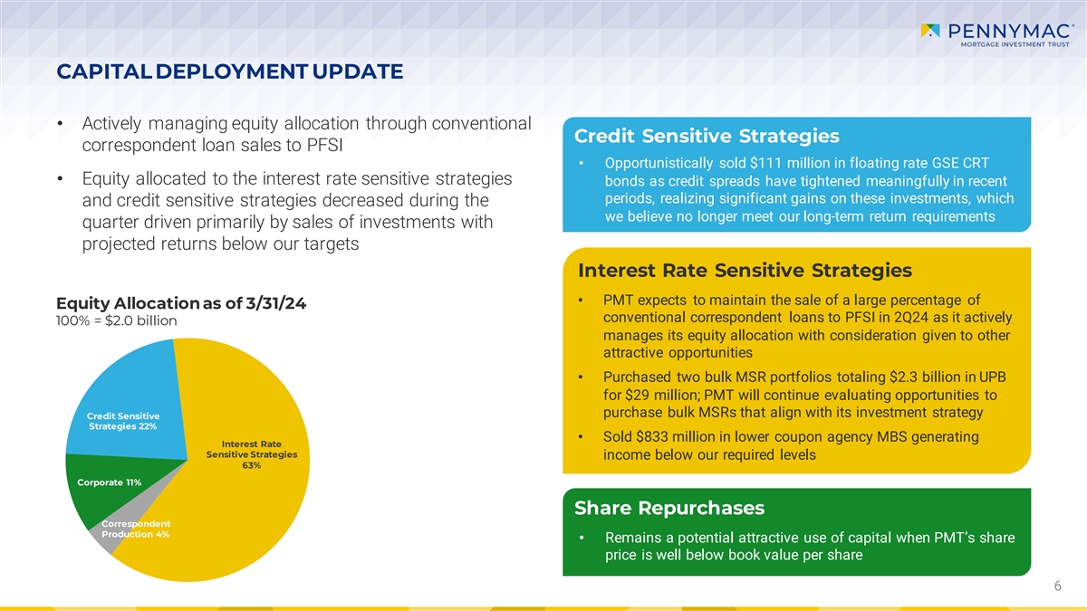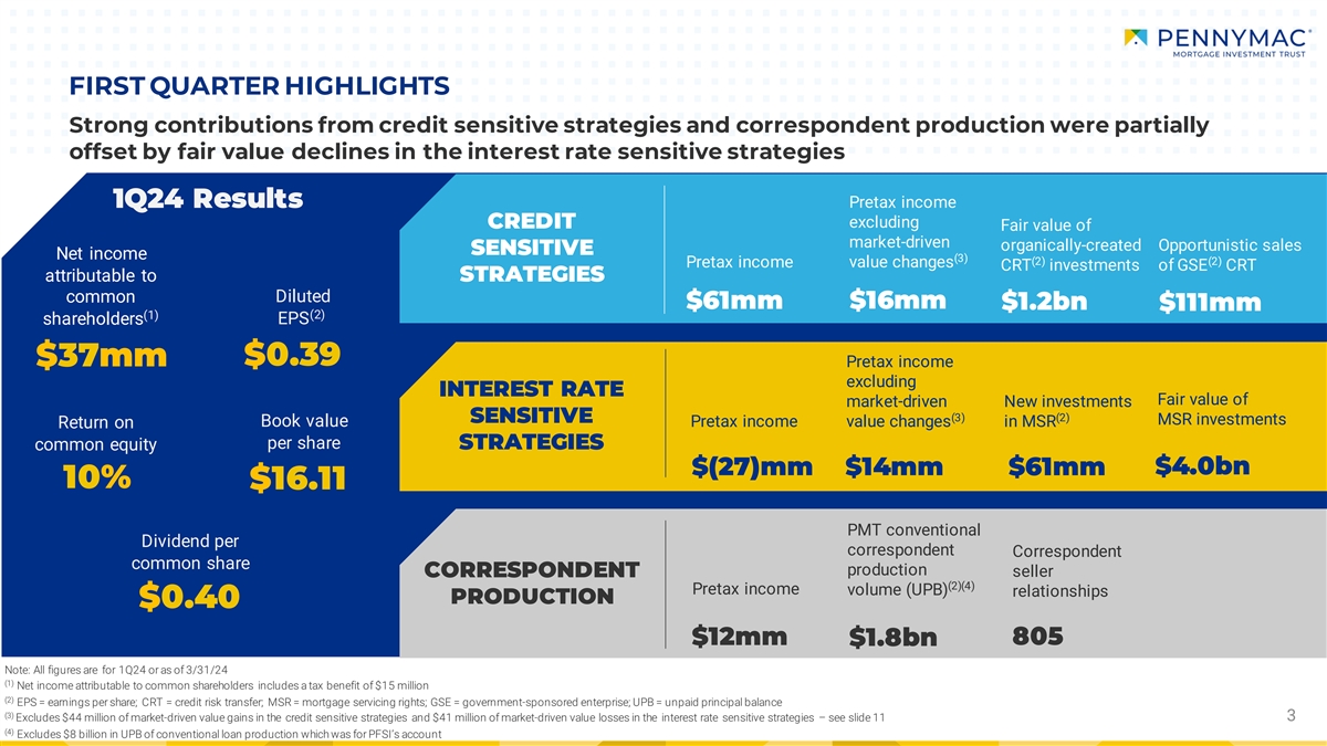 PMTs results in the first quarter reflect solid overall performance driven by strong results in the credit sensitive strategies and correspondent production partially offset by net fair value declines in the interest rate sensitive strategies, said Chairman and CEO David Spector. We continue to leverage PMTs synergistic relationship with its manager and services provider, PFSI, to actively manage PMTs portfolio. We took advantage of meaningful credit spread tightening in recent periods, opportunistically selling more than $100 million of previously-purchased GSE CRT bonds and realizing significant gains on these investments, which we believe no longer meet our long-term return requirements. Additionally, credit spread tightening drove our ability to issue more than $550 million in CRT term notes at attractive terms, effectively refinancing similar notes.