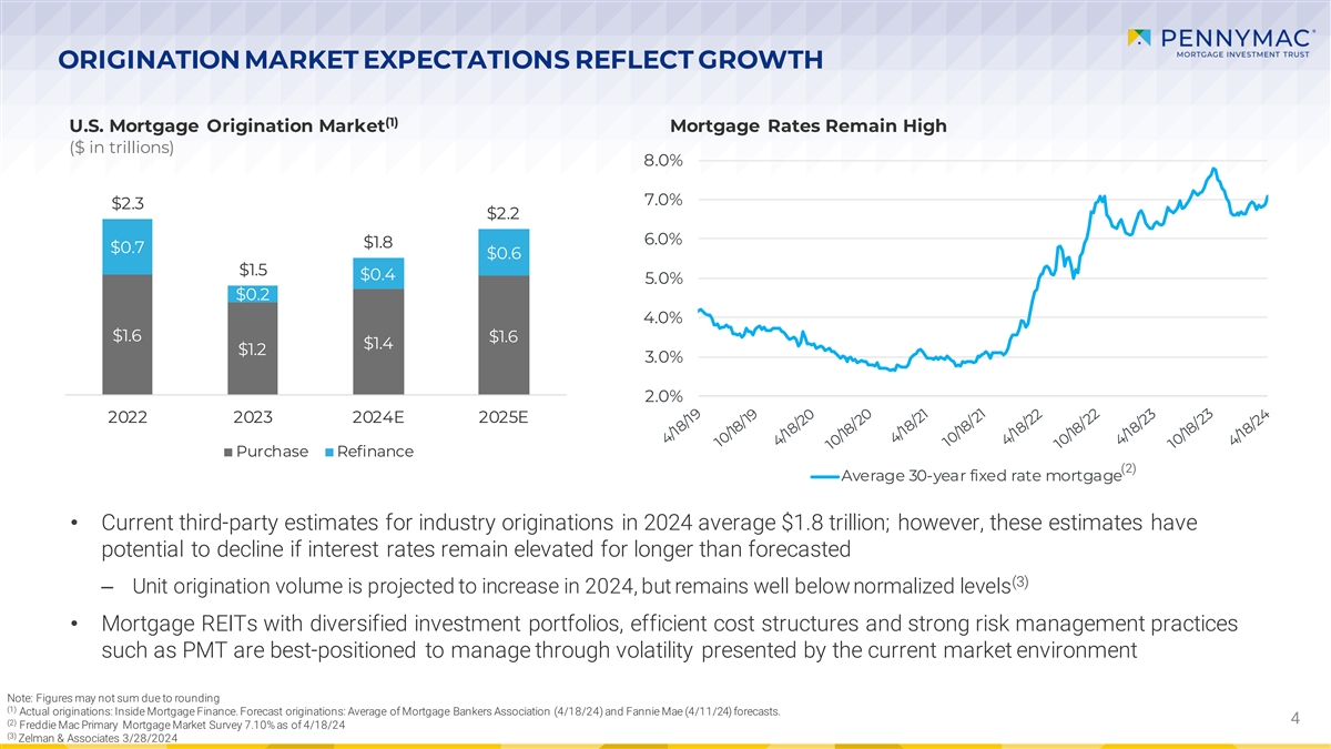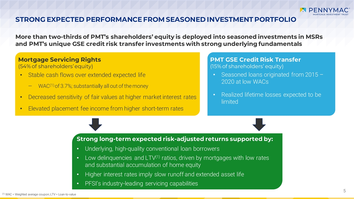 ORIGINATION MARKET EXPECTATIONS REFLECT GROWTH (1) U.S. Mortgage Origination Market Mortgage Rates Remain High ($ in trillions) 8.0% 7.0% $2.3 $2.2 6.0% $1.8 $0.7 $0.6 $1.5 $0.4 5.0% $0.2 4.0% $1.6 $1.6 $1.4 $1.2 3.0% 2.0% 2022 2023 2024E 2025E Purchase Refinance (2) Average 30-year fixed rate mortgage • Current third-party estimates for industry originations in 2024 average $1.8 trillion; however, these estimates have potential to decline if interest rates remain elevated for longer than forecasted (3) ‒ Unit origination volume is projected to increase in 2024, but remains well below normalized levels • Mortgage REITs with diversified investment portfolios, efficient cost structures and strong risk management practices such as PMT are best-positioned to manage through volatility presented by the current market environment Note: Figures may not sum due to rounding (1) Actual originations: Inside Mortgage Finance. Forecast originations: Average of Mortgage Bankers Association (4/18/24) and Fannie Mae (4/11/24) forecasts. 4 (2) Freddie Mac Primary Mortgage Market Survey 7.10% as of 4/18/24 (3) Zelman & Associates 3/28/2024