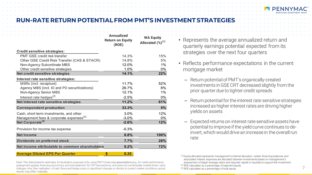 CAPITAL DEPLOYMENT UPDATE • Actively managing equity allocation through conventional Credit Sensitive Strategies correspondent loan sales to PFSI • Opportunistically sold $111 million in floating rate GSE CRT • Equity allocated to the interest rate sensitive strategies bonds as credit spreads have tightened meaningfully in recent periods, realizing significant gains on these investments, which and credit sensitive strategies decreased during the we believe no longer meet our long-term return requirements quarter driven primarily by sales of investments with projected returns below our targets Interest Rate Sensitive Strategies • PMT expects to maintain the sale of a large percentage of Equity Allocation as of 3/31/24 conventional correspondent loans to PFSI in 2Q24 as it actively 100% = $2.0 billion manages its equity allocation with consideration given to other attractive opportunities • Purchased two bulk MSR portfolios totaling $2.3 billion in UPB for $29 million; PMT will continue evaluating opportunities to purchase bulk MSRs that align with its investment strategy Credit Sensitive Strategies 22% • Sold $833 million in lower coupon agency MBS generating Interest Rate Sensitive Strategies income below our required levels 63% Corporate 11% Share Repurchases Correspondent Production 4% • Remains a potential attractive use of capital when PMT’s share price is well below book value per share 6