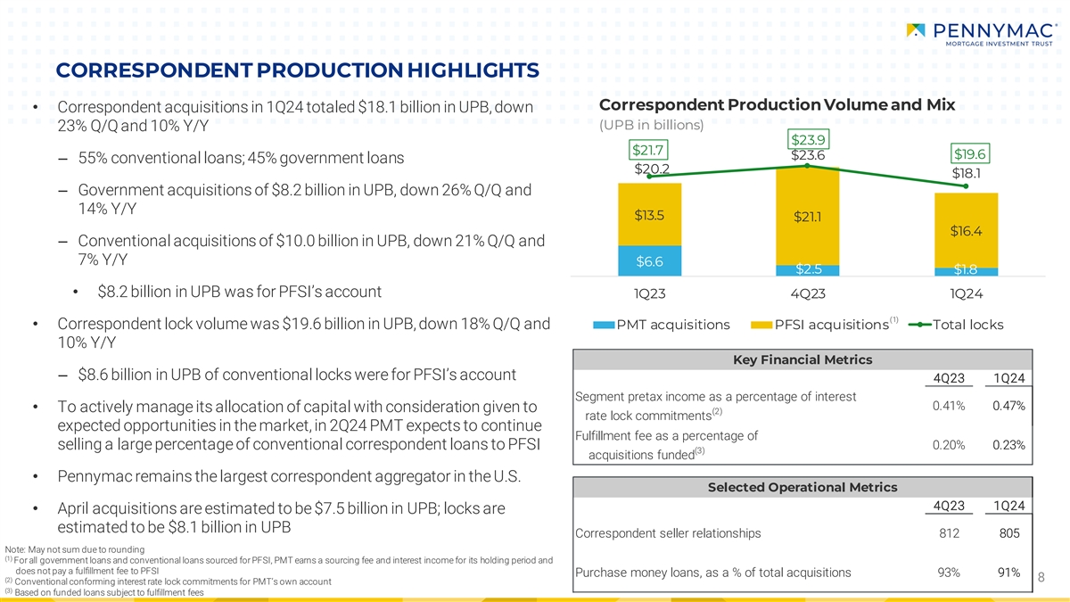 | | Conventional correspondent loan production volumes for PMTs account totaled $1.8 billion in unpaid principal balance (UPB), down 29 percent from the prior quarter and 73 percent from the first quarter of 2023 as a result of the sale of a large percentage of conventional loans to PennyMac Financial Services, Inc. (NYSE: PFSI) |