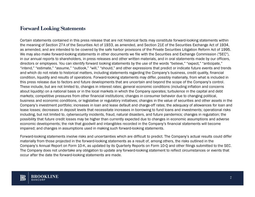 Forward Looking Statements 2 Certain statements contained in this press release that are not historical facts may constitute forward - looking statements within the meaning of Section 27A of the Securities Act of 1933, as amended, and Section 21E of the Securities Exchange Act of 1934, as amended, and are intended to be covered by the safe harbor provisions of the Private Securities Litigation Reform Act of 1995. We may also make forward - looking statements in other documents we file with the Securities and Exchange Commission ("SEC"), in our annual reports to shareholders, in press releases and other written materials, and in oral statements made by our officers, directors or employees. You can identify forward looking statements by the use of the words “believe,” “expect,” “anticipate,” “intend,” “estimate,” “assume,” “outlook,” “will,” “should,” and other expressions that predict or indicate future events and trends and which do not relate to historical matters, including statements regarding the Company’s business, credit quality, financial condition, liquidity and results of operations. Forward - looking statements may differ, possibly materially, from what is included in this press release due to factors and future developments that are uncertain and beyond the scope of the Company’s control. These include, but are not limited to, changes in interest rates; general economic conditions (including inflation and concerns about liquidity) on a national basis or in the local markets in which the Company operates; turbulence in the capital and debt markets; competitive pressures from other financial institutions; changes in consumer behavior due to changing political, business and economic conditions, or legislative or regulatory initiatives; changes in the value of securities and other assets in the Company’s investment portfolio; increases in loan and lease default and charge - off rates; the adequacy of allowances for loan and lease losses; decreases in deposit levels that necessitate increases in borrowing to fund loans and investments; operational risks including, but not limited to, cybersecurity incidents, fraud, natural disasters, and future pandemics; changes in regulation; the possibility that future credit losses may be higher than currently expected due to changes in economic assumptions and adverse economic developments; the risk that goodwill and intangibles recorded in the Company’s financial statements will become impaired; and changes in assumptions used in making such forward - looking statements. Forward - looking statements involve risks and uncertainties which are difficult to predict. The Company’s actual results could differ materially from those projected in the forward - looking statements as a result of, among others, the risks outlined in the Company’s Annual Report on Form 10 - K, as updated by its Quarterly Reports on Form 10 - Q and other filings submitted to the SEC. The Company does not undertake any obligation to update any forward - looking statement to reflect circumstances or events that occur after the date the forward - looking statements are made.