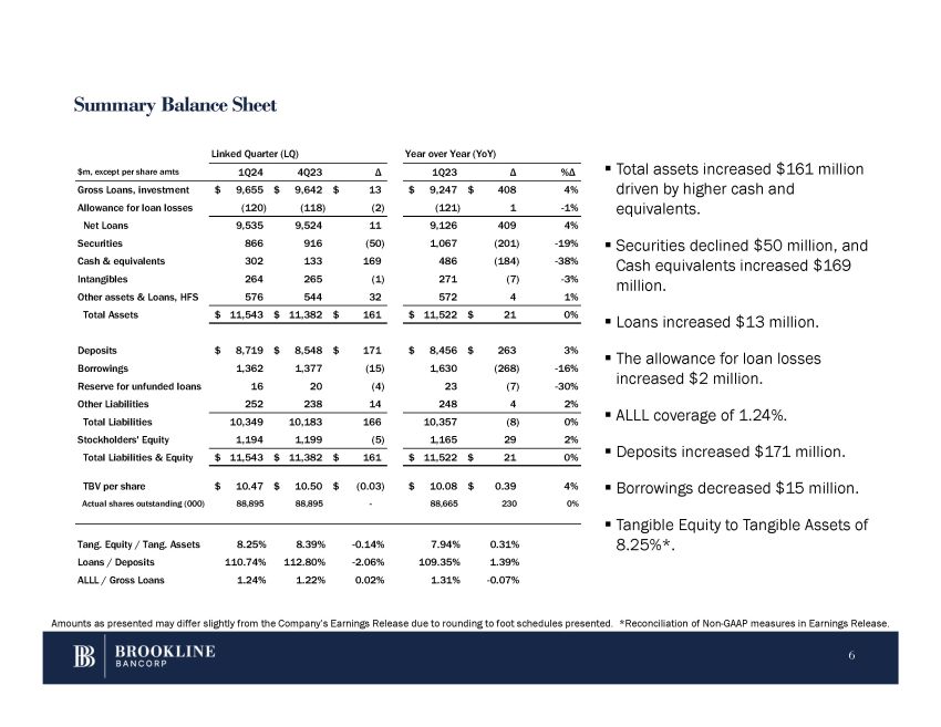 Total assets at March 31, 2024 were $11.5 billion, representing an increase of $160.5 million from $11.4 billion at December 31, 2023, and an increase of $20.2 million from March 31, 2023. At March 31, 2024, total loans and leases were $9.7 billion, representing an increase of $13.5 million from December 31, 2023, and an increase of $408.1 million from March 31, 2023.