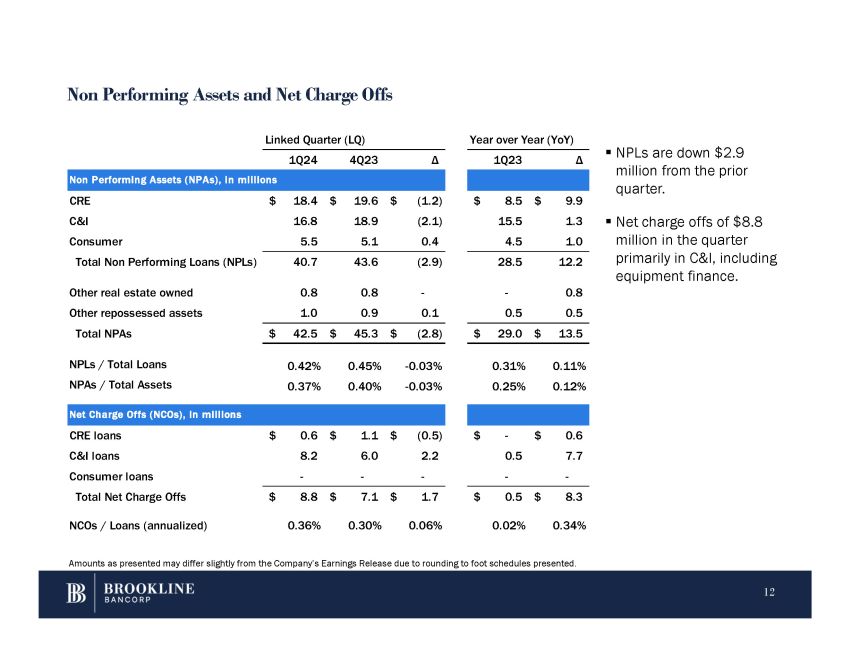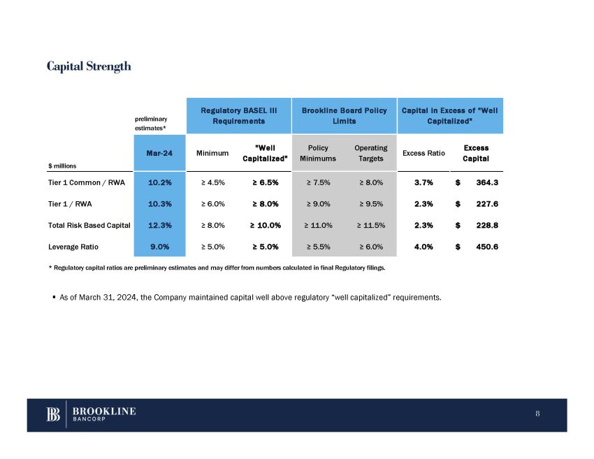 Loan and Deposit Composition 15% 14% 60% 11% Loans 19% 7% 20% 24% 19% 11% CRE C&I Equipment Consumer Deposits DDA NOW Savings MMkt CDs Brkd Amounts as presented may differ slightly from the Company’s Earnings Release due to rounding to foot schedules presented. %Δ Δ 1Q23 Δ 4Q23 1Q24 $ millions 3% $ 144 $ 5,611 $ (10) $ 5,765 $ 5,755 CRE 16% 141 901 13 1,029 1,042 Commercial S 10% 129 1,246 4 1,371 1,375 Equipment Finance OA N 0% (6) 1,489 6 1,477 1,483 Consumer L Total Loans $ 9,655 $ 9,642 $ 13 $ 9,247 $ 408 4% Demand deposits NOW Savings Money market CDs Brokered deposits Total Deposits $ 1,629 655 1,728 2,066 1,670 971 $ 1,678 $ (49) 662 (7) 1,669 59 2,083 (17) 1,575 95 881 90 $ 1,899 758 1,268 2,186 1,363 982 $ (270) - 14% (103) - 14% 460 36% (120) - 5% 307 23% (11) - 1% $ 8,719 $ 8,548 $ 171 $ 8,456 $ 263 3% Linked Quarter (LQ) Year over Year (YoY) DEPOSITS 7