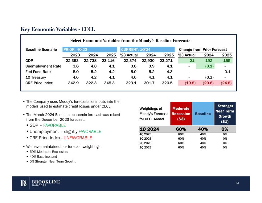 Non Performing Assets and Net Charge Offs Linked Quarter (LQ) 1Q24 4Q23 Δ Year over Year (YoY) 1Q23 Δ Non Performing Assets (NPAs), in millions Amounts as presented may differ slightly from the Company’s Earnings Release due to rounding to foot schedules presented. 12 ▪ NPLs are down $ 2 . 9 million from the prior quarter . $ 9.9 $ 8.5 $ (1.2) $ 19.6 $ 18.4 CRE ▪ Net charge offs of $8.8 1.3 15.5 (2.1) 18.9 16.8 C&I million in the quarter 1.0 4.5 0.4 5.1 5.5 Consumer primarily in C&I, includin equipment finance. 12.2 28.5 (2.9) 43.6 Total Non Performing Loans (NPLs) 40.7 0.8 - - 0.8 Other real estate owned 0.8 0.5 0.5 0.1 0.9 Other repossessed assets 1.0 $ 13.5 $ 29.0 $ (2.8) $ 45.3 Total NPAs $ 42.5 0.11% 0.31% - 0.03% 0.45% NPLs / Total Loans 0.42% 0.12% 0.25% - 0.03% 0.40% NPAs / Total Assets 0.37% Net Charge Offs (NCOs), in millions $ 0.6 $ - $ (0.5) $ 1.1 $ 0.6 CRE loans 7.7 0.5 2.2 6.0 8.2 C&I loans - - - - - Consumer loans $ 8.3 $ 0.5 $ 1.7 $ 7.1 $ 8.8 Total Net Charge Offs 0.34% 0.02% 0.06% 0.30% 0.36% NCOs / Loans (annualized) g