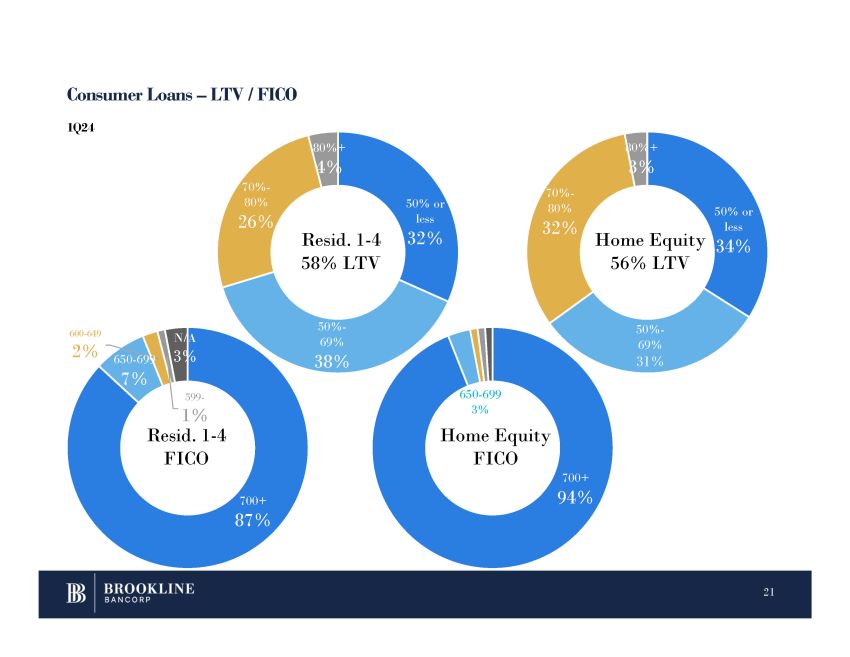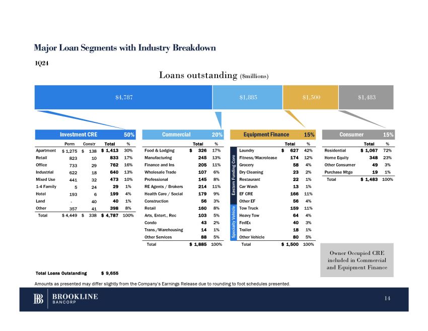 Investment CRE 50% Commercial 20% Equipment Finance 15% Consumer 15% Perm Constr Total % Total % Total % Total % Food & Lodging Manufacturing Finance and Ins Wholesale Trade Professional RE Agents / Brokers Health Care / Social Construction Retail Arts, Entert., Rec Condo Trans./Warehousing Other Services $ 326 17% 245 13% 205 11% 107 6% 145 8% 214 11% 179 9% 56 3% 160 8% 103 5% 43 2% 14 1% 88 5% Residential Home Equity Other Consumer Purchase Mtge $ 1,067 72% 348 23% 49 3% 19 1% Total $ 1,483 100% - Apartment Retail Office Industrial Mixed Use 1 - 4 Family Hotel Land Other 357 $ 1,275 $ 138 823 10 733 29 622 18 441 32 5 24 193 6 40 41 $ 1,413 30% 833 17% 762 16% 640 13% 473 10% 29 1% 199 4% 40 1% 398 8% Total $ 4,449 $ 338 $ 4,787 100% Total $ 1,885 100% Total $ 1,500 100% 42% $ 627 Laundry Eastern Funding Core 12% 174 Fitness/Macrolease 4% 58 Grocery 2% 23 Dry Cleaning 1% 22 Restaurant 1% 13 Car Wash 11% 166 EF CRE 4% 56 Other EF 11% 159 Tow Truck Specialty Vehicle 4% 64 Heavy Tow 3% 40 FedEx 1% 18 Trailer 5% 80 Other Vehicle Total Loans Outstanding $ 9,655 Amounts as presented may differ slightly from the Company’s Earnings Release due to rounding to foot schedules presented. Major Loan Segments with Industry Breakdown $4,787 $1,885 $1,500 $1,483 1Q24 Loans outstanding ($millions) Owner Occupied CRE included in Commercial and Equipment Finance 14