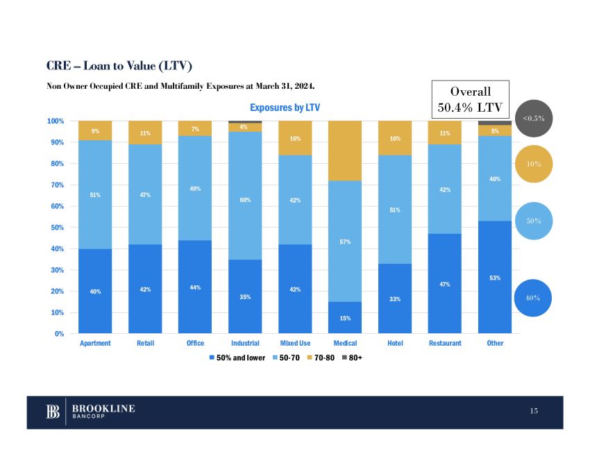 CRE – Loan to Value (LTV) 40% 42% 44% 35% 42% 15% 33% 47% 53% 51% 47% 49% 60% 42% 57% 51% 42% 40% 9% 11% 7% 4% 16% 16% 11% 5% 0% 10% 20% 30% 40% 50% 60% 70% 80% 90% 100% Apartment Retail Office Medical Hotel Restaurant Other Exposures by LTV Industrial 50% and lower Mixed Use 50 - 70 70 - 80 80+ Non Owner Occupied CRE and Multifamily Exposures at March 31, 2024. 40% 50% <0.5% 10% Overall 50.4% LTV 15