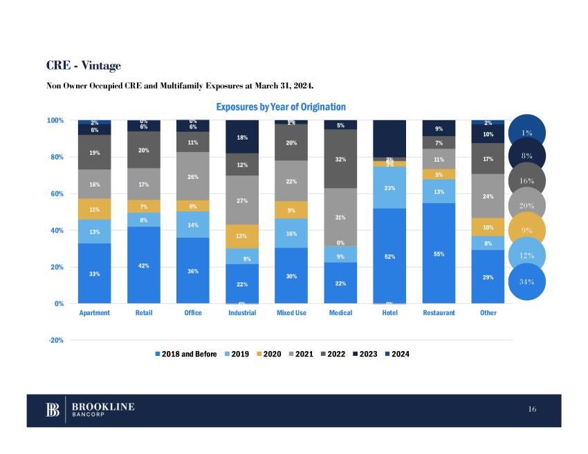 33% 42% 36% 22% 30% 22% 52% 55% 29% 13% 8% 14% 9% 16% 9% 23% 13% 8% 11% 7% 6% 13% 9% 0% 3% 5% 10% 16% 17% 26% 27% 22% 31% 11% 24% 19% 20% 11% 12% 20% 32% 0 2% 7% 17% 6% 6% 6% 18% 5% 9% 10% 2% 0% 0% 0% 2 0% 0% 2% - 20% 0% 20% 40% 60% 80% 100% Apartment Retail Office Industrial Mixed Use Medical Hotel Restaurant Other Non Owner Occupied CRE and Multifamily Exposures at March 31, 2024. Exposures by Year of Origination 2018 and Before 2019 2020 2021 2022 2023 2024 1 % CRE - Vintage 8 % 16 % 20 % 9 % 12 % 34 % 16