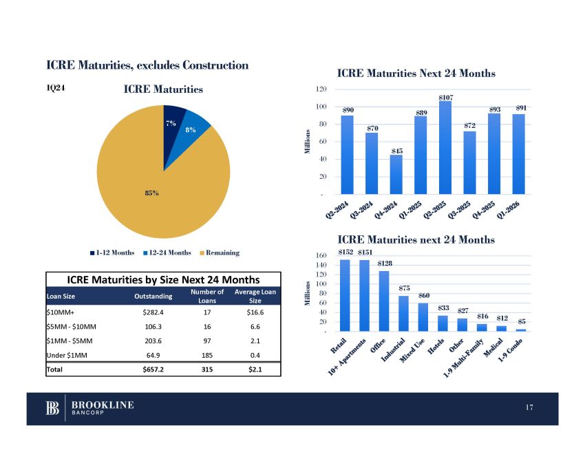 ICRE Repricing, excludes Construction and Swapped/Floating Rate Loans ICRE Repricing Next 24 Months Average Loan Size Number of Loans Outstanding Loan Size $13.6 1 $13.6 $10MM+ 5.8 5 28.9 $5MM - $10MM 2.3 86 195.1 $1MM - $5MM 0.4 135 54.9 Under $1MM $1.3 227 $292.5 Total 3% 3% 93% ICRE Repricing 1 - 12 Months 12 - 24 Months Remaining ICRE $48 $36 $37 $26 $42 $20 $37 $48 - 60 50 40 30 20 10 Millions ICRE Repricing Next 24 Months $66 $47 $28 $27 $25 $14 $5 $4 $1 ICRE Repricing Next 24 Months $74 80 70 60 50 40 30 20 10 0 Millions 20 1Q24