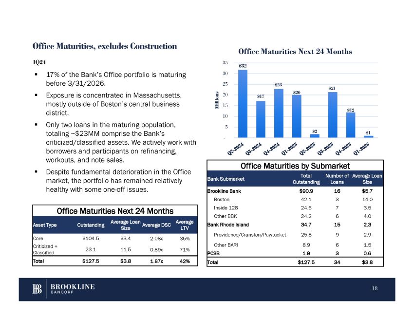 ICRE Maturities, excludes Construction ICRE Maturities by Size Next 24 Months Average Loan Size Number of Loans Outstanding Loan Size $16.6 17 $282.4 $10MM+ 6.6 16 106.3 $5MM - $10MM 2.1 97 203.6 $1MM - $5MM 0.4 185 64.9 Under $1MM $2.1 315 $657.2 Total 7% 8% 85% ICRE Maturities 1 - 12 Months 12 - 24 Months Remaining $90 $70 $45 $89 $107 $72 $93 $91 - 40 20 60 80 100 120 Millions ICRE Maturities Next 24 Months ICRE Maturities next 24 Months $152 $151 $128 $75 $60 $33 $27 $16 $12 $5 - 160 140 120 100 80 60 40 20 Millions 17 1Q24