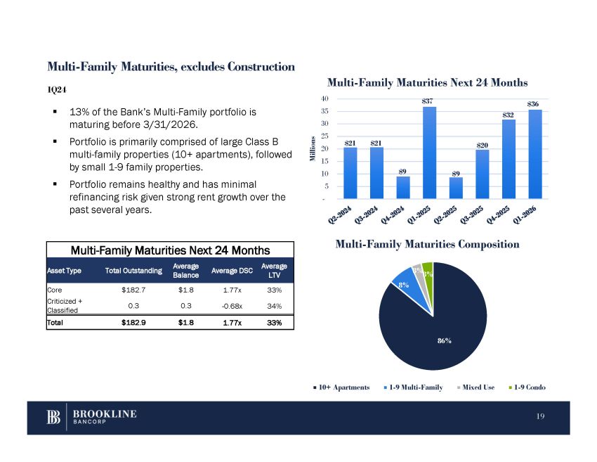 Office Maturities, excludes Construction Office Maturities by Submarket Average Loan Size Number of Loans Total Outstanding Bank Submarket $5.7 16 $90.9 Brookline Bank 14.0 3 42.1 Boston 3.5 7 24.6 Inside 128 4.0 6 24.2 Other BBK 2.3 15 34.7 Bank Rhode Island 2.9 9 25.8 Providence/Cranston/Pawtucket 1.5 6 8.9 Other BARI 0.6 3 1.9 PCSB $3.8 34 $127.5 Total Office Maturities Next 24 Months $32 $17 $23 $20 $2 $21 $12 $1 - 35 30 25 20 15 10 5 Millions 18 Office Maturities Next 24 Months Average LTV Average Loan Average DSC Size Outstanding Asset Type 35% 2.08x $3.4 $104.5 Core 71% 0.89x 11.5 23.1 Criticized + Classified 42% 1.87x $3.8 $127.5 Total ▪ 17 % of the Bank’s Office portfolio is maturing before 3 / 31 / 2026 . ▪ Exposure is concentrated in Massachusetts, mostly outside of Boston’s central business district . ▪ Only two loans in the maturing population, totaling ~$23MM comprise the Bank’s criticized/classified assets. We actively work with borrowers and participants on refinancing, workouts, and note sales. ▪ Despite fundamental deterioration in the Office market, the portfolio has remained relatively healthy with some one - off issues. 1Q24