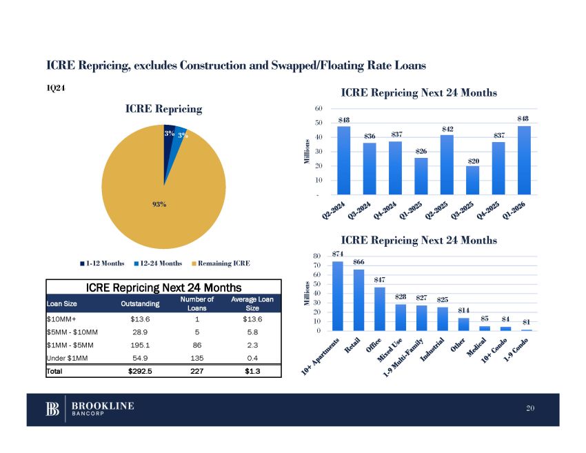 Multi - Family Maturities, excludes Construction 86% 8% 3% 3% Multi - Family Maturities Composition 10+ Apartments 1 - 9 Multi - Family Mixed Use 1 - 9 Condo $21 $21 $9 $37 $9 $20 $32 $36 - 40 35 30 25 20 15 10 5 Millions 19 Multi - Family Maturities Next 24 Months Multi - Family Maturities Next 24 Months Average LTV Average DSC Average Balance Total Outstanding Asset Type 33% 1.77x $1.8 $182.7 Core 34% - 0.68x 0.3 0.3 Criticized + Classified 33% 1.77x $1.8 $182.9 Total ▪ 13% of the Bank’s Multi - Family portfolio is maturing before 3/31/2026. ▪ Portfolio is primarily comprised of large Class B multi - family properties (10+ apartments), followed by small 1 - 9 family properties. ▪ Portfolio remains healthy and has minimal refinancing risk given strong rent growth over the past several years. 1Q24