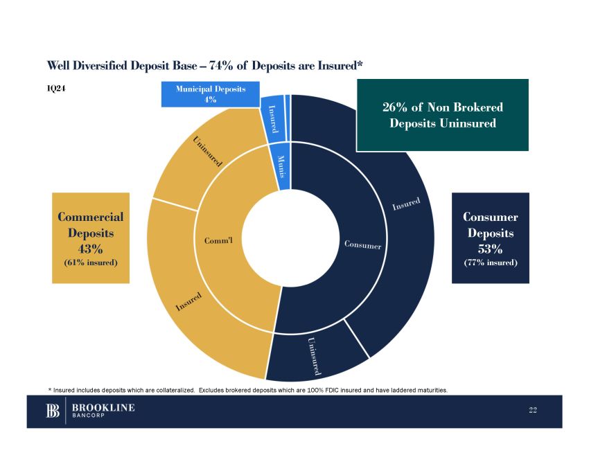 Well Diversified Deposit Base – 74% of Deposits are Insured* Consumer Deposits 53% (77% insured) Commercial Deposits 43% (61% insured) Municipal Deposits 4% * Insured includes deposits which are collateralized. Excludes brokered deposits which are 100% FDIC insured and have laddered maturities. 26% of Non Brokered Deposits Uninsured 22 1Q24
