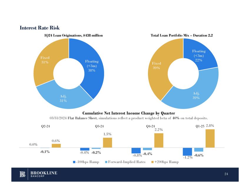 Interest Rate Risk Floating (<3m) 38% Adj. 31% Fixed 31% 1Q24 Loan Originations, $438 million Total Loan Portfolio Mix – Duration 2.2 - 1.2% - 0.1% - 0.4% - 0.2% - 0.8% - 0.4% - 0.6% 0.6% 0.0% 1.5% Q4 - 24 2.2% Q1 - 25 2.8% Cumulative Net Interest Income Change by Quarter 03/31/2024 Flat Balance Sheet , simulations reflect a product weighted beta of 40% on total deposits. - 100bps Ramp Forward - Implied Rates +200bps Ramp Q2 - 24 Q3 - 24 Floating (<3m) 22% 24 Adj. 39% Fixed 39%
