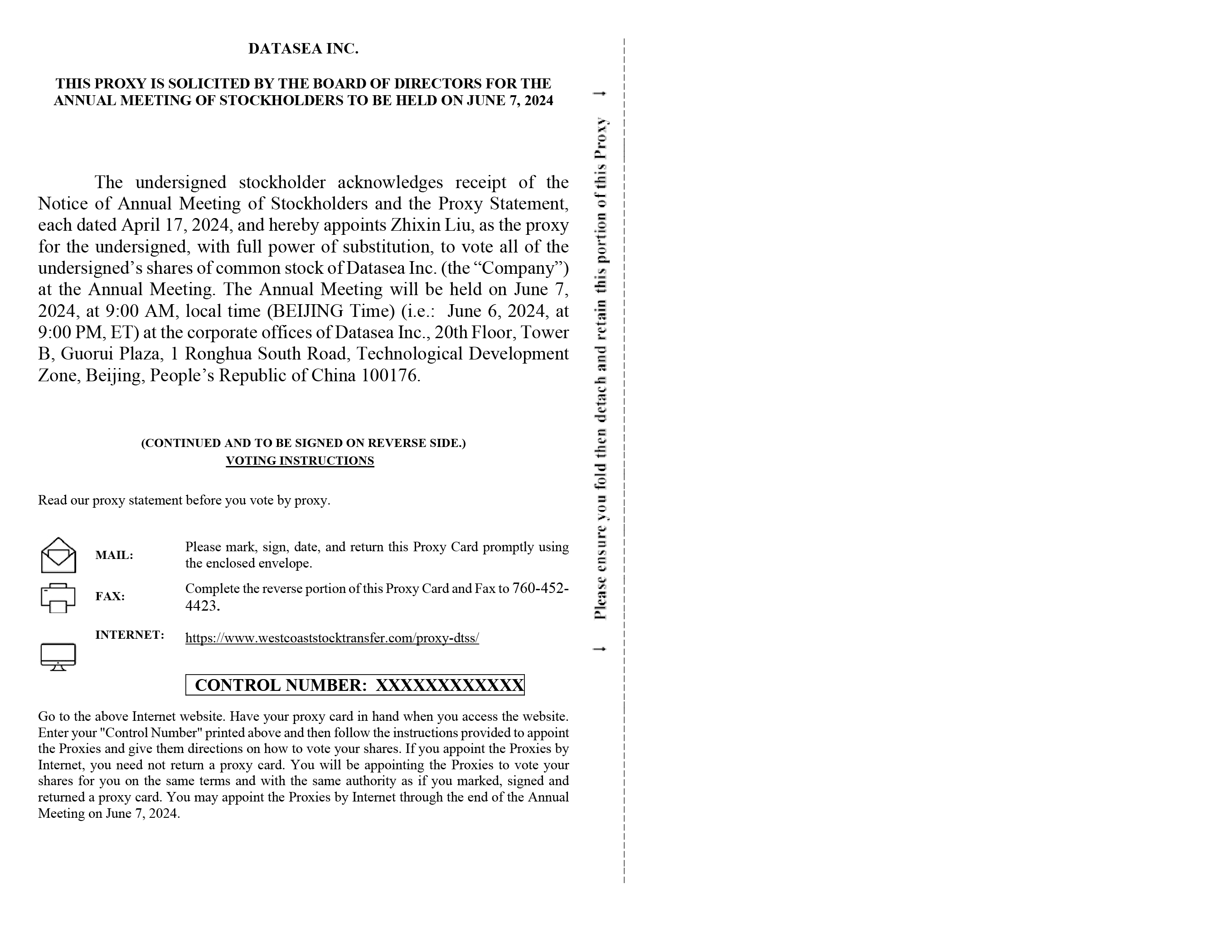 DATASEA INC. THIS PROXY IS SOLICITED BY THE BOARD OF DIRECTORS FOR THE ANNUAL MEETING OF STOCKHOLDERS TO BE HELD ON JUNE 7, 2024 The undersigned stockholder acknowledges receipt of the Notice of Annual Meeting of Stockholders and the Proxy Statement, each dated April 17, 2024, and hereby appoints Zhixin Liu, as the proxy for the undersigned, with full power of substitution, to vote all of the undersigned’s shares of common stock of Datasea Inc. (the “Company”) at the Annual Meeting. The Annual Meeting will be held on June 7, 2024, at 9:00 AM, local time (BEIJING Time) (i.e.: June 6, 2024, at 9:00 PM, ET) at the corporate offices of Datasea Inc., 20th Floor, Tower B, Guorui Plaza, 1 Ronghua South Road, Technological Development Zone, Beijing, People’s Republic of China 100176. (CONTINUED AND TO BE SIGNED ON REVERSE SIDE.) VOTING INSTRUCTIONS Read our proxy statement before you vote by proxy. MAIL: Please mark, sign, date, and return this Proxy Card promptly using the enclosed envelope. FAX: Complete the reverse portion of this Proxy Card and Fax to 760-452-4423. INTERNET: https://www.westcoaststocktransfer.com/proxy-dtss/ 0CONTROL NUMBER: XXXXXXXXXXXX Go to the above Internet website. Have your proxy card in hand when you access the website. Enter your “Control Number” printed above and then follow the instructions provided to appoint the Proxies and give them directions on how to vote your shares. If you appoint the Proxies by Internet, you need not return a proxy card. You will be appointing the Proxies to vote your shares for you on the same terms and with the same authority as if you marked, signed and returned a proxy card. You may appoint the Proxies by Internet through the end of the Annual Meeting on June 7, 2024.