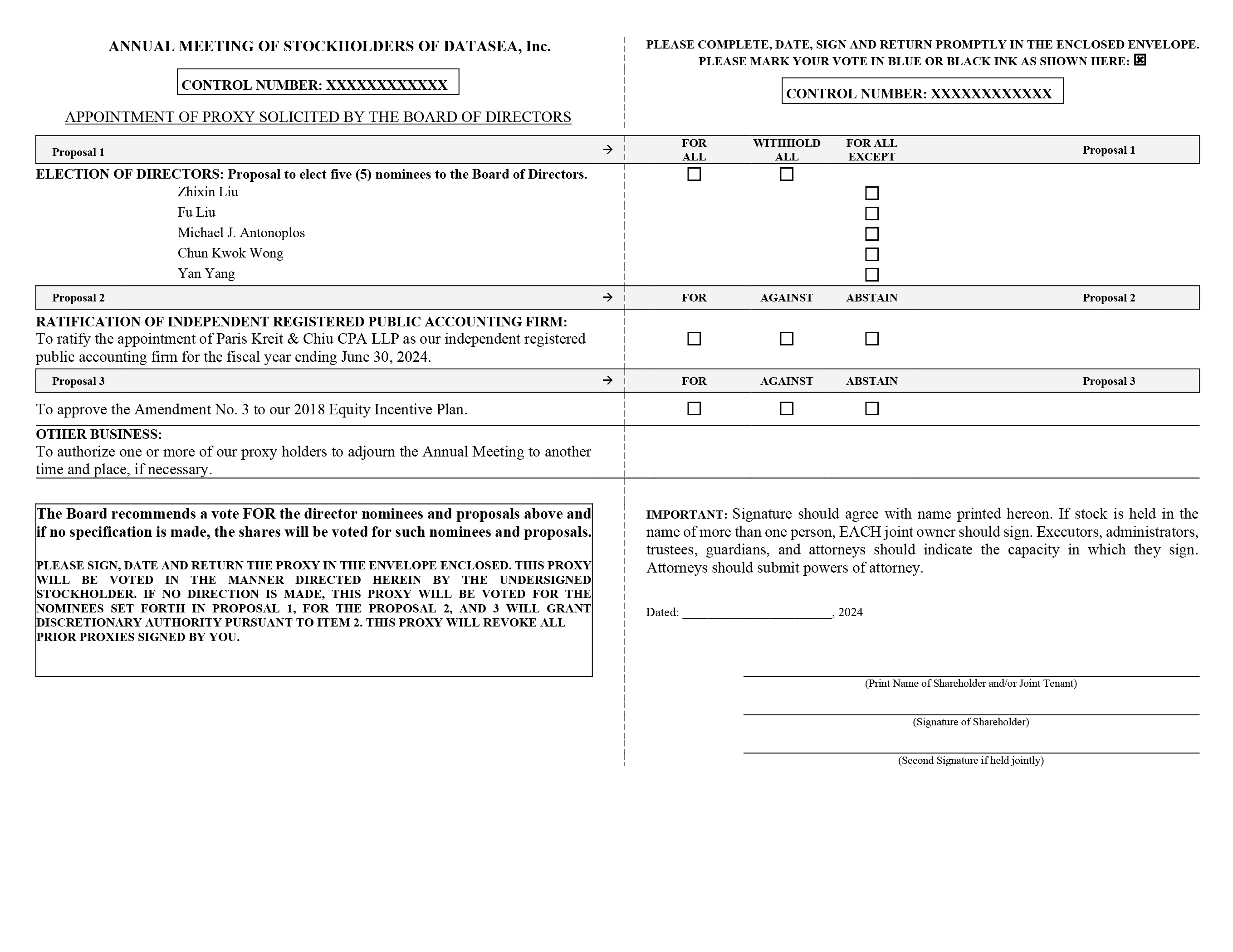 ANNUAL MEETING OF STOCKHOLDERS OF DATASEA, Inc. PLEASE COMPLETE, DATE, SIGN AND RETURN PROMPTLY IN THE ENCLOSED ENVELOPE. PLEASE MARK YOUR VOTE IN BLUE OR BLACK INK AS SHOWN HERE: CONTROL NUMBER: XXXXXXXXXXXX0 APPOINTMENT OF PROXY SOLICITED BY THE BOARD OF DIRECTORS CONTROL NUMBER: XXXXXXXXXXXX0 Proposal 1 FOR ALL WITHHOLD ALL FOR ALL EXCEPT Proposal 1 ELECTION OF DIRECTORS: Proposal to elect five (5) nominees to the Board of Directors. Zhixin Liu Fu Liu Michael J. Antonoplos Chun Kwok Wong Yan Yang Proposal 2 FOR AGAINST ABSTAIN Proposal 2 RATIFICATION OF INDEPENDENT REGISTERED PUBLIC ACCOUNTING FIRM: To ratify the appointment of Paris Kreit & Chiu CPA LLP as our independent registered public accounting firm for the fiscal year ending June 30, 2024. Proposal 3 FOR AGAINST ABSTAIN Proposal 3 To approve the Amendment No. 3 to our 2018 Equity Incentive Plan. OTHER BUSINESS: To authorize one or more of our proxy holders to adjourn the Annual Meeting to another time and place, if necessary. The Board recommends a vote FOR the director nominees and proposals above and if no specification is made, the shares will be voted for such nominees and proposals. PLEASE SIGN, DATE AND RETURN THE PROXY IN THE ENVELOPE ENCLOSED. THIS PROXY WILL BE VOTED IN THE MANNER DIRECTED HEREIN BY THE UNDERSIGNED STOCKHOLDER. IF NO DIRECTION IS MADE, THIS PROXY WILL BE VOTED FOR THE NOMINEES SET FORTH IN PROPOSAL 1, FOR THE PROPOSAL 2, AND 3 WILL GRANT DISCRETIONARY AUTHORITY PURSUANT TO ITEM 2. THIS PROXY WILL REVOKE ALL PRIOR PROXIES SIGNED BY YOU. IMPORTANT: Signature should agree with name printed hereon. If stock is held in the name of more than one person, EACH joint owner should sign. Executors, administrators, trustees, guardians, and attorneys should indicate the capacity in which they sign. Attorneys should submit powers of attorney. Dated:, 2024 (Print Name of Shareholder and/or Joint Tenant)(Signature of Shareholder) (Second Signature if held jointly)