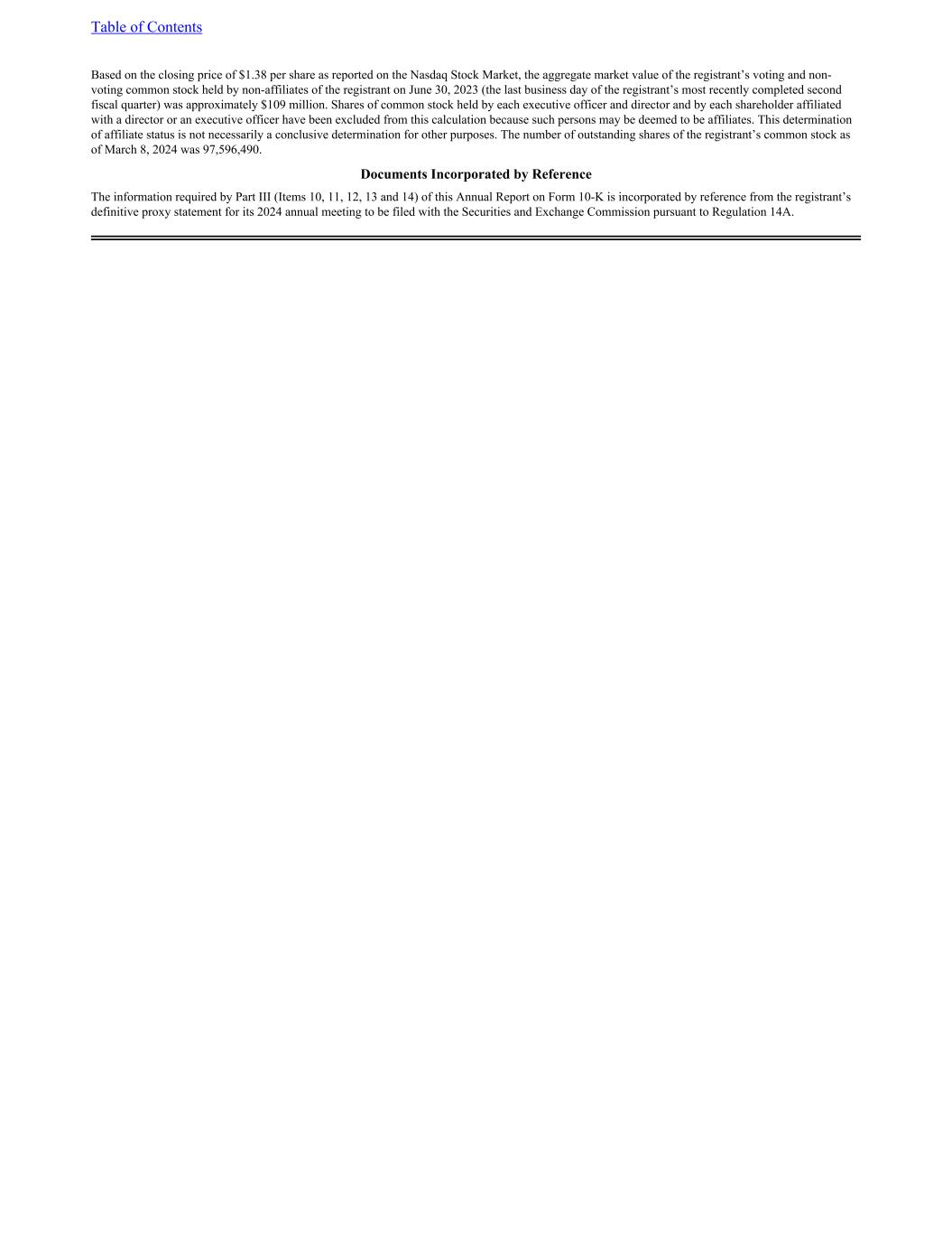 Based on the closing price of $1.38 per share as reported on the Nasdaq Stock Market, the aggregate market value of the registrant’s voting and non- voting common stock held by non-affiliates of the registrant on June 30, 2023 (the last business day of the registrant’s most recently completed second fiscal quarter) was approximately $109 million. Shares of common stock held by each executive officer and director and by each shareholder affiliated with a director or an executive officer have been excluded from this calculation because such persons may be deemed to be affiliates. This determination of affiliate status is not necessarily a conclusive determination for other purposes. The number of outstanding shares of the registrant’s common stock as of March 8, 2024 was 97,596,490. Documents Incorporated by Reference The information required by Part III (Items 10, 11, 12, 13 and 14) of this Annual Report on Form 10-K is incorporated by reference from the registrant’s definitive proxy statement for its 2024 annual meeting to be filed with the Securities and Exchange Commission pursuant to Regulation 14A. Table of Contents