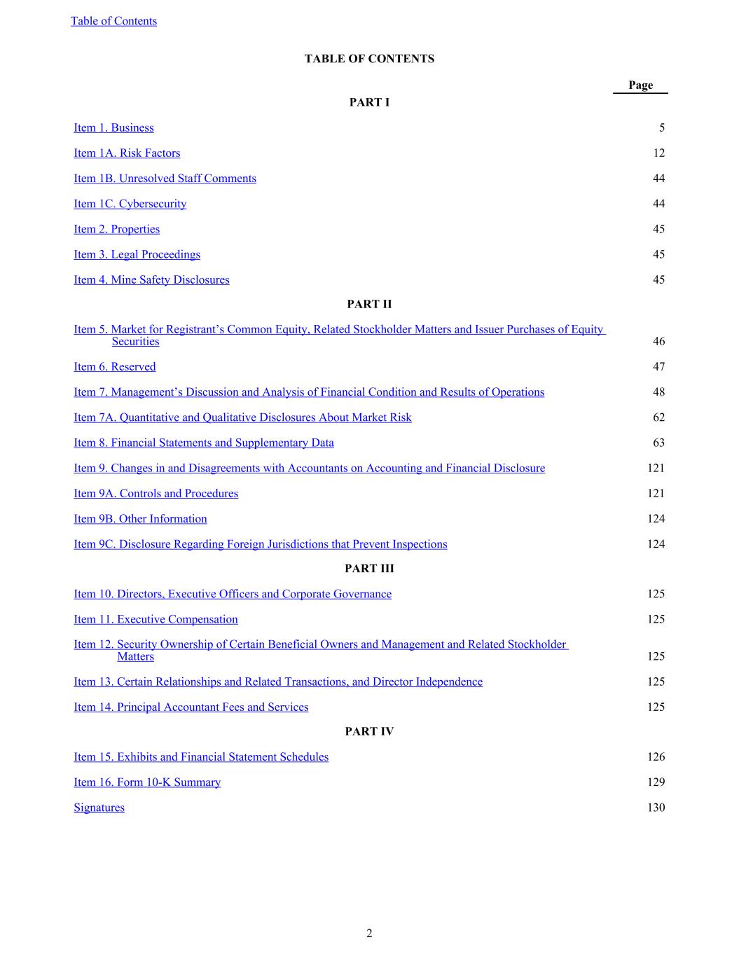 TABLE OF CONTENTS Page PART I Item 1. Business 5 Item 1A. Risk Factors 12 Item 1B. Unresolved Staff Comments 44 Item 1C. Cybersecurity 44 Item 2. Properties 45 Item 3. Legal Proceedings 45 Item 4. Mine Safety Disclosures 45 PART II Item 5. Market for Registrant’s Common Equity, Related Stockholder Matters and Issuer Purchases of Equity Securities 46 Item 6. Reserved 47 Item 7. Management’s Discussion and Analysis of Financial Condition and Results of Operations 48 Item 7A. Quantitative and Qualitative Disclosures About Market Risk 62 Item 8. Financial Statements and Supplementary Data 63 Item 9. Changes in and Disagreements with Accountants on Accounting and Financial Disclosure 121 Item 9A. Controls and Procedures 121 Item 9B. Other Information 124 Item 9C. Disclosure Regarding Foreign Jurisdictions that Prevent Inspections 124 PART III Item 10. Directors, Executive Officers and Corporate Governance 125 Item 11. Executive Compensation 125 Item 12. Security Ownership of Certain Beneficial Owners and Management and Related Stockholder Matters 125 Item 13. Certain Relationships and Related Transactions, and Director Independence 125 Item 14. Principal Accountant Fees and Services 125 PART IV Item 15. Exhibits and Financial Statement Schedules 126 Item 16. Form 10-K Summary 129 Signatures 130 Table of Contents 2