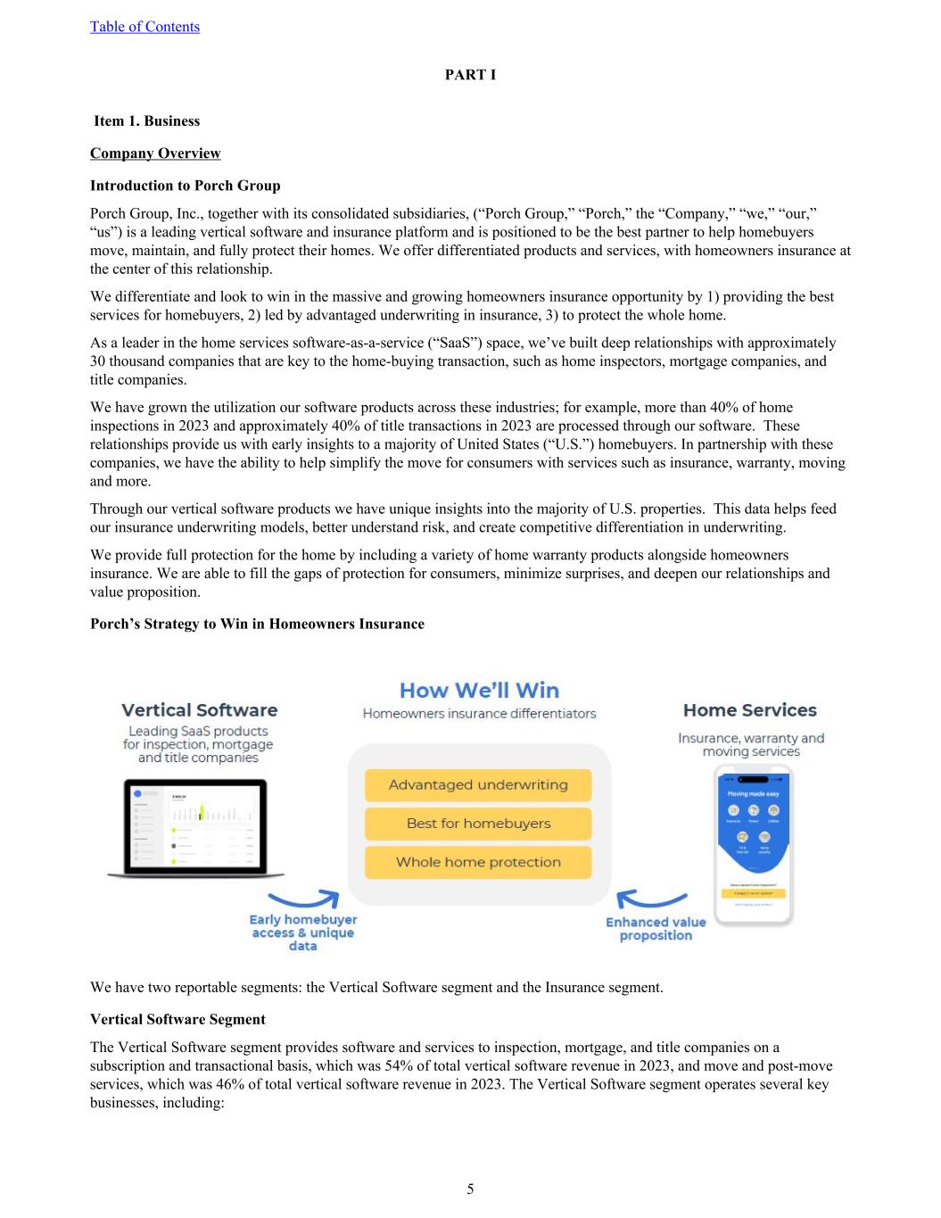 PART I Item 1. Business Company Overview Introduction to Porch Group Porch Group, Inc., together with its consolidated subsidiaries, (“Porch Group,” “Porch,” the “Company,” “we,” “our,” “us”) is a leading vertical software and insurance platform and is positioned to be the best partner to help homebuyers move, maintain, and fully protect their homes. We offer differentiated products and services, with homeowners insurance at the center of this relationship. We differentiate and look to win in the massive and growing homeowners insurance opportunity by 1) providing the best services for homebuyers, 2) led by advantaged underwriting in insurance, 3) to protect the whole home. As a leader in the home services software-as-a-service (“SaaS”) space, we’ve built deep relationships with approximately 30 thousand companies that are key to the home-buying transaction, such as home inspectors, mortgage companies, and title companies. We have grown the utilization our software products across these industries; for example, more than 40% of home inspections in 2023 and approximately 40% of title transactions in 2023 are processed through our software. These relationships provide us with early insights to a majority of United States (“U.S.”) homebuyers. In partnership with these companies, we have the ability to help simplify the move for consumers with services such as insurance, warranty, moving and more. Through our vertical software products we have unique insights into the majority of U.S. properties. This data helps feed our insurance underwriting models, better understand risk, and create competitive differentiation in underwriting. We provide full protection for the home by including a variety of home warranty products alongside homeowners insurance. We are able to fill the gaps of protection for consumers, minimize surprises, and deepen our relationships and value proposition. Porch’s Strategy to Win in Homeowners Insurance We have two reportable segments: the Vertical Software segment and the Insurance segment. Vertical Software Segment The Vertical Software segment provides software and services to inspection, mortgage, and title companies on a subscription and transactional basis, which was 54% of total vertical software revenue in 2023, and move and post-move services, which was 46% of total vertical software revenue in 2023. The Vertical Software segment operates several key businesses, including: Table of Contents 5