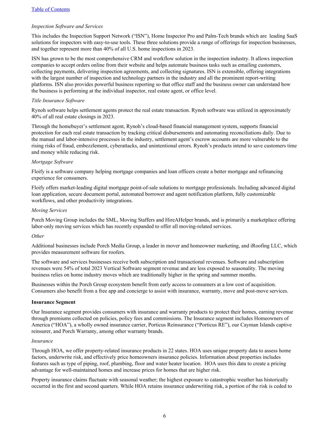 Inspection Software and Services This includes the Inspection Support Network (“ISN”), Home Inspector Pro and Palm-Tech brands which are leading SaaS solutions for inspectors with easy-to-use tools. These three solutions provide a range of offerings for inspection businesses, and together represent more than 40% of all U.S. home inspections in 2023. ISN has grown to be the most comprehensive CRM and workflow solution in the inspection industry. It allows inspection companies to accept orders online from their website and helps automate business tasks such as emailing customers, collecting payments, delivering inspection agreements, and collecting signatures. ISN is extensible, offering integrations with the largest number of inspection and technology partners in the industry and all the prominent report-writing platforms. ISN also provides powerful business reporting so that office staff and the business owner can understand how the business is performing at the individual inspector, real estate agent, or office level. Title Insurance Software Rynoh software helps settlement agents protect the real estate transaction. Rynoh software was utilized in approximately 40% of all real estate closings in 2023. Through the homebuyer’s settlement agent, Rynoh’s cloud-based financial management system, supports financial protection for each real estate transaction by tracking critical disbursements and automating reconciliations daily. Due to the manual and labor-intensive processes in the industry, settlement agent’s escrow accounts are more vulnerable to the rising risks of fraud, embezzlement, cyberattacks, and unintentional errors. Rynoh’s products intend to save customers time and money while reducing risk. Mortgage Software Floify is a software company helping mortgage companies and loan officers create a better mortgage and refinancing experience for consumers. Floify offers market-leading digital mortgage point-of-sale solutions to mortgage professionals. Including advanced digital loan application, secure document portal, automated borrower and agent notification platform, fully customizable workflows, and other productivity integrations. Moving Services Porch Moving Group includes the SML, Moving Staffers and HireAHelper brands, and is primarily a marketplace offering labor-only moving services which has recently expanded to offer all moving-related services. Other Additional businesses include Porch Media Group, a leader in mover and homeowner marketing, and iRoofing LLC, which provides measurement software for roofers. The software and services businesses receive both subscription and transactional revenues. Software and subscription revenues were 54% of total 2023 Vertical Software segment revenue and are less exposed to seasonality. The moving business relies on home industry moves which are traditionally higher in the spring and summer months. Businesses within the Porch Group ecosystem benefit from early access to consumers at a low cost of acquisition. Consumers also benefit from a free app and concierge to assist with insurance, warranty, move and post-move services. Insurance Segment Our Insurance segment provides consumers with insurance and warranty products to protect their homes, earning revenue through premiums collected on policies, policy fees and commissions. The Insurance segment includes Homeowners of America (“HOA”), a wholly owned insurance carrier, Porticus Reinsurance (“Porticus RE”), our Cayman Islands captive reinsurer, and Porch Warranty, among other warranty brands. Insurance Through HOA, we offer property-related insurance products in 22 states. HOA uses unique property data to assess home factors, underwrite risk, and effectively price homeowners insurance policies. Information about properties includes features such as type of piping, roof, plumbing, floor and water heater location. HOA uses this data to create a pricing advantage for well-maintained homes and increase prices for homes that are higher risk. Property insurance claims fluctuate with seasonal weather; the highest exposure to catastrophic weather has historically occurred in the first and second quarters. While HOA retains insurance underwriting risk, a portion of the risk is ceded to Table of Contents 6