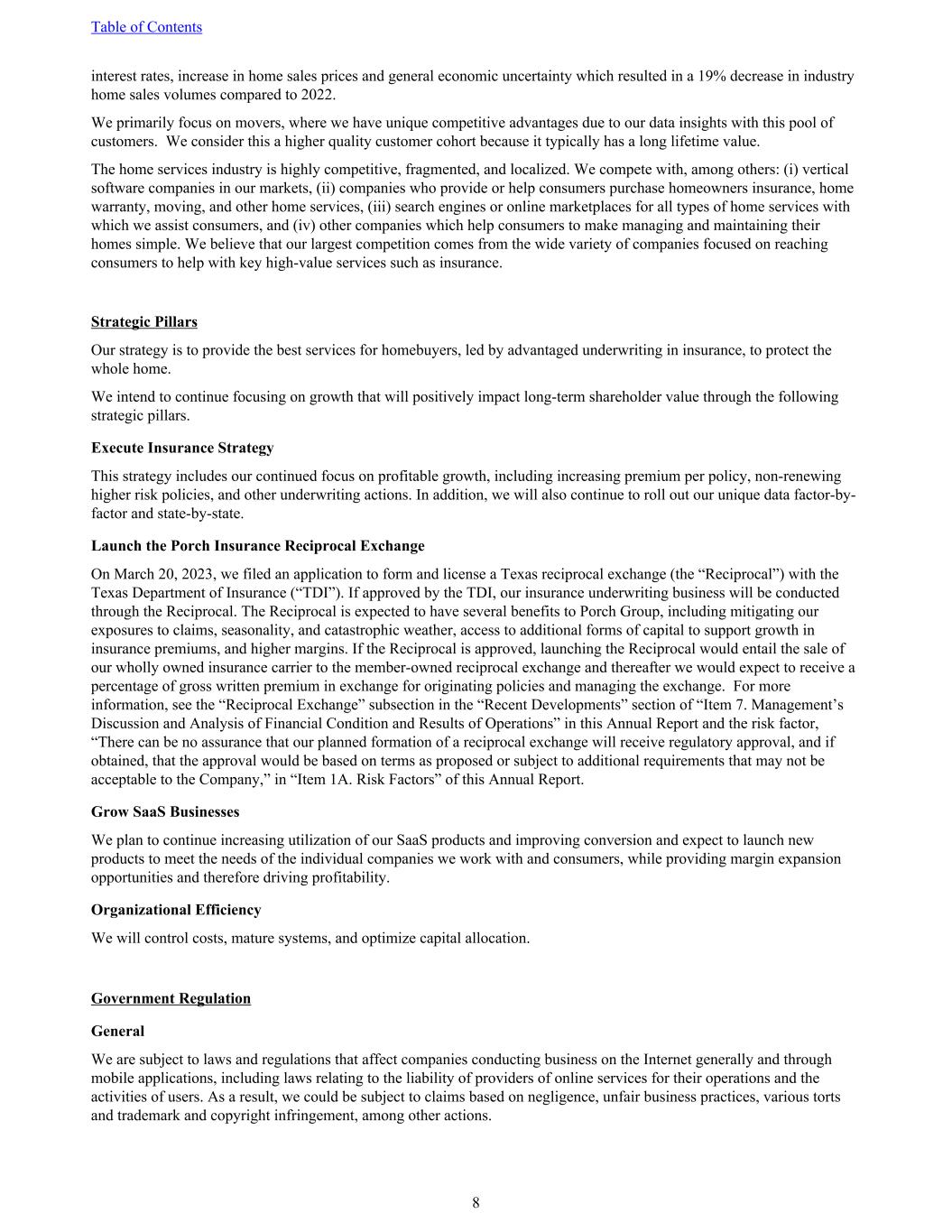 interest rates, increase in home sales prices and general economic uncertainty which resulted in a 19% decrease in industry home sales volumes compared to 2022. We primarily focus on movers, where we have unique competitive advantages due to our data insights with this pool of customers. We consider this a higher quality customer cohort because it typically has a long lifetime value. The home services industry is highly competitive, fragmented, and localized. We compete with, among others: (i) vertical software companies in our markets, (ii) companies who provide or help consumers purchase homeowners insurance, home warranty, moving, and other home services, (iii) search engines or online marketplaces for all types of home services with which we assist consumers, and (iv) other companies which help consumers to make managing and maintaining their homes simple. We believe that our largest competition comes from the wide variety of companies focused on reaching consumers to help with key high-value services such as insurance. Strategic Pillars Our strategy is to provide the best services for homebuyers, led by advantaged underwriting in insurance, to protect the whole home. We intend to continue focusing on growth that will positively impact long-term shareholder value through the following strategic pillars. Execute Insurance Strategy This strategy includes our continued focus on profitable growth, including increasing premium per policy, non-renewing higher risk policies, and other underwriting actions. In addition, we will also continue to roll out our unique data factor-by- factor and state-by-state. Launch the Porch Insurance Reciprocal Exchange On March 20, 2023, we filed an application to form and license a Texas reciprocal exchange (the “Reciprocal”) with the Texas Department of Insurance (“TDI”). If approved by the TDI, our insurance underwriting business will be conducted through the Reciprocal. The Reciprocal is expected to have several benefits to Porch Group, including mitigating our exposures to claims, seasonality, and catastrophic weather, access to additional forms of capital to support growth in insurance premiums, and higher margins. If the Reciprocal is approved, launching the Reciprocal would entail the sale of our wholly owned insurance carrier to the member-owned reciprocal exchange and thereafter we would expect to receive a percentage of gross written premium in exchange for originating policies and managing the exchange. For more information, see the “Reciprocal Exchange” subsection in the “Recent Developments” section of “Item 7. Management’s Discussion and Analysis of Financial Condition and Results of Operations” in this Annual Report and the risk factor, “There can be no assurance that our planned formation of a reciprocal exchange will receive regulatory approval, and if obtained, that the approval would be based on terms as proposed or subject to additional requirements that may not be acceptable to the Company,” in “Item 1A. Risk Factors” of this Annual Report. Grow SaaS Businesses We plan to continue increasing utilization of our SaaS products and improving conversion and expect to launch new products to meet the needs of the individual companies we work with and consumers, while providing margin expansion opportunities and therefore driving profitability. Organizational Efficiency We will control costs, mature systems, and optimize capital allocation. Government Regulation General We are subject to laws and regulations that affect companies conducting business on the Internet generally and through mobile applications, including laws relating to the liability of providers of online services for their operations and the activities of users. As a result, we could be subject to claims based on negligence, unfair business practices, various torts and trademark and copyright infringement, among other actions. Table of Contents 8