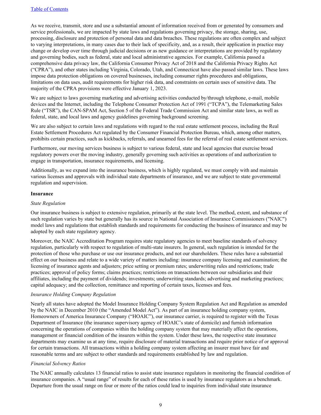As we receive, transmit, store and use a substantial amount of information received from or generated by consumers and service professionals, we are impacted by state laws and regulations governing privacy, the storage, sharing, use, processing, disclosure and protection of personal data and data breaches. These regulations are often complex and subject to varying interpretations, in many cases due to their lack of specificity, and, as a result, their application in practice may change or develop over time through judicial decisions or as new guidance or interpretations are provided by regulatory and governing bodies, such as federal, state and local administrative agencies. For example, California passed a comprehensive data privacy law, the California Consumer Privacy Act of 2018 and the California Privacy Rights Act (“CPRA”), and other states including Virginia, Colorado, Utah, and Connecticut have also passed similar laws. These laws impose data protection obligations on covered businesses, including consumer rights procedures and obligations, limitations on data uses, audit requirements for higher risk data, and constraints on certain uses of sensitive data. The majority of the CPRA provisions were effective January 1, 2023. We are subject to laws governing marketing and advertising activities conducted by/through telephone, e-mail, mobile devices and the Internet, including the Telephone Consumer Protection Act of 1991 (“TCPA”), the Telemarketing Sales Rule (“TSR”), the CAN-SPAM Act, Section 5 of the Federal Trade Commission Act and similar state laws, as well as federal, state, and local laws and agency guidelines governing background screening. We are also subject to certain laws and regulations with regard to the real estate settlement process, including the Real Estate Settlement Procedures Act regulated by the Consumer Financial Protection Bureau, which, among other matters, prohibits certain practices, such as kickbacks, referrals, and unearned fees for the referral of real estate settlement services. Furthermore, our moving services business is subject to various federal, state and local agencies that exercise broad regulatory powers over the moving industry, generally governing such activities as operations of and authorization to engage in transportation, insurance requirements, and licensing. Additionally, as we expand into the insurance business, which is highly regulated, we must comply with and maintain various licenses and approvals with individual state departments of insurance, and we are subject to state governmental regulation and supervision. Insurance State Regulation Our insurance business is subject to extensive regulation, primarily at the state level. The method, extent, and substance of such regulation varies by state but generally has its source in National Association of Insurance Commissioners ("NAIC") model laws and regulations that establish standards and requirements for conducting the business of insurance and may be adopted by each state regulatory agency. Moreover, the NAIC Accreditation Program requires state regulatory agencies to meet baseline standards of solvency regulation, particularly with respect to regulation of multi-state insurers. In general, such regulation is intended for the protection of those who purchase or use our insurance products, and not our shareholders. These rules have a substantial effect on our business and relate to a wide variety of matters including: insurance company licensing and examination; the licensing of insurance agents and adjusters; price setting or premium rates; underwriting rules and restrictions; trade practices; approval of policy forms; claims practices; restrictions on transactions between our subsidiaries and their affiliates, including the payment of dividends; investments; underwriting standards; advertising and marketing practices; capital adequacy; and the collection, remittance and reporting of certain taxes, licenses and fees. Insurance Holding Company Regulation Nearly all states have adopted the Model Insurance Holding Company System Regulation Act and Regulation as amended by the NAIC in December 2010 (the “Amended Model Act”). As part of an insurance holding company system, Homeowners of America Insurance Company (“HOAIC”), our insurance carrier, is required to register with the Texas Department of Insurance (the insurance supervisory agency of HOAIC’s state of domicile) and furnish information concerning the operations of companies within the holding company system that may materially affect the operations, management or financial condition of the insurers within the system. Under these laws, the respective state insurance departments may examine us at any time, require disclosure of material transactions and require prior notice of or approval for certain transactions. All transactions within a holding company system affecting an insurer must have fair and reasonable terms and are subject to other standards and requirements established by law and regulation. Financial Solvency Ratios The NAIC annually calculates 13 financial ratios to assist state insurance regulators in monitoring the financial condition of insurance companies. A “usual range” of results for each of these ratios is used by insurance regulators as a benchmark. Departure from the usual range on four or more of the ratios could lead to inquiries from individual state insurance Table of Contents 9