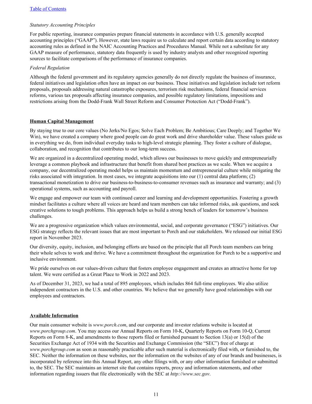 Statutory Accounting Principles For public reporting, insurance companies prepare financial statements in accordance with U.S. generally accepted accounting principles (“GAAP”). However, state laws require us to calculate and report certain data according to statutory accounting rules as defined in the NAIC Accounting Practices and Procedures Manual. While not a substitute for any GAAP measure of performance, statutory data frequently is used by industry analysts and other recognized reporting sources to facilitate comparisons of the performance of insurance companies. Federal Regulation Although the federal government and its regulatory agencies generally do not directly regulate the business of insurance, federal initiatives and legislation often have an impact on our business. These initiatives and legislation include tort reform proposals, proposals addressing natural catastrophe exposures, terrorism risk mechanisms, federal financial services reforms, various tax proposals affecting insurance companies, and possible regulatory limitations, impositions and restrictions arising from the Dodd-Frank Wall Street Reform and Consumer Protection Act (“Dodd-Frank”). Human Capital Management By staying true to our core values (No Jerks/No Egos; Solve Each Problem; Be Ambitious; Care Deeply; and Together We Win), we have created a company where good people can do great work and drive shareholder value. These values guide us in everything we do, from individual everyday tasks to high-level strategic planning. They foster a culture of dialogue, collaboration, and recognition that contributes to our long-term success. We are organized in a decentralized operating model, which allows our businesses to move quickly and entrepreneurially leverage a common playbook and infrastructure that benefit from shared best practices as we scale. When we acquire a company, our decentralized operating model helps us maintain momentum and entrepreneurial culture while mitigating the risks associated with integration. In most cases, we integrate acquisitions into our (1) central data platform; (2) transactional monetization to drive our business-to-business-to-consumer revenues such as insurance and warranty; and (3) operational systems, such as accounting and payroll. We engage and empower our team with continued career and learning and development opportunities. Fostering a growth mindset facilitates a culture where all voices are heard and team members can take informed risks, ask questions, and seek creative solutions to tough problems. This approach helps us build a strong bench of leaders for tomorrow’s business challenges. We are a progressive organization which values environmental, social, and corporate governance (“ESG”) initiatives. Our ESG strategy reflects the relevant issues that are most important to Porch and our stakeholders. We released our initial ESG report in November 2023. Our diversity, equity, inclusion, and belonging efforts are based on the principle that all Porch team members can bring their whole selves to work and thrive. We have a commitment throughout the organization for Porch to be a supportive and inclusive environment. We pride ourselves on our values-driven culture that fosters employee engagement and creates an attractive home for top talent. We were certified as a Great Place to Work in 2022 and 2023. As of December 31, 2023, we had a total of 895 employees, which includes 864 full-time employees. We also utilize independent contractors in the U.S. and other countries. We believe that we generally have good relationships with our employees and contractors. Available Information Our main consumer website is www.porch.com, and our corporate and investor relations website is located at www.porchgroup.com. You may access our Annual Reports on Form 10-K, Quarterly Reports on Form 10-Q, Current Reports on Form 8-K, and amendments to those reports filed or furnished pursuant to Section 13(a) or 15(d) of the Securities Exchange Act of 1934 with the Securities and Exchange Commission (the “SEC”) free of charge at www.porchgroup.com as soon as reasonably practicable after such material is electronically filed with, or furnished to, the SEC. Neither the information on these websites, nor the information on the websites of any of our brands and businesses, is incorporated by reference into this Annual Report, any other filings with, or any other information furnished or submitted to, the SEC. The SEC maintains an internet site that contains reports, proxy and information statements, and other information regarding issuers that file electronically with the SEC at http://www.sec.gov. Table of Contents 11