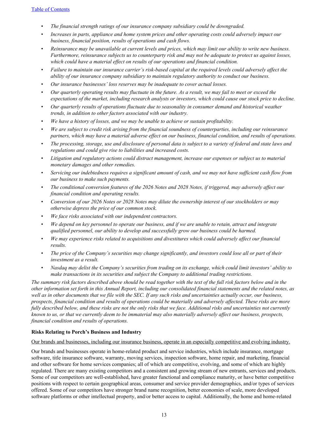 • The financial strength ratings of our insurance company subsidiary could be downgraded. • Increases in parts, appliance and home system prices and other operating costs could adversely impact our business, financial position, results of operations and cash flows. • Reinsurance may be unavailable at current levels and prices, which may limit our ability to write new business. Furthermore, reinsurance subjects us to counterparty risk and may not be adequate to protect us against losses, which could have a material effect on results of our operations and financial condition. • Failure to maintain our insurance carrier’s risk-based capital at the required levels could adversely affect the ability of our insurance company subsidiary to maintain regulatory authority to conduct our business. • Our insurance businesses’ loss reserves may be inadequate to cover actual losses. • Our quarterly operating results may fluctuate in the future. As a result, we may fail to meet or exceed the expectations of the market, including research analysts or investors, which could cause our stock price to decline. • Our quarterly results of operations fluctuate due to seasonality in consumer demand and historical weather trends, in addition to other factors associated with our industry. • We have a history of losses, and we may be unable to achieve or sustain profitability. • We are subject to credit risk arising from the financial soundness of counterparties, including our reinsurance partners, which may have a material adverse effect on our business, financial condition, and results of operations. • The processing, storage, use and disclosure of personal data is subject to a variety of federal and state laws and regulations and could give rise to liabilities and increased costs. • Litigation and regulatory actions could distract management, increase our expenses or subject us to material monetary damages and other remedies. • Servicing our indebtedness requires a significant amount of cash, and we may not have sufficient cash flow from our business to make such payments. • The conditional conversion features of the 2026 Notes and 2028 Notes, if triggered, may adversely affect our financial condition and operating results. • Conversion of our 2026 Notes or 2028 Notes may dilute the ownership interest of our stockholders or may otherwise depress the price of our common stock. • We face risks associated with our independent contractors. • We depend on key personnel to operate our business, and if we are unable to retain, attract and integrate qualified personnel, our ability to develop and successfully grow our business could be harmed. • We may experience risks related to acquisitions and divestitures which could adversely affect our financial results. • The price of the Company’s securities may change significantly, and investors could lose all or part of their investment as a result. • Nasdaq may delist the Company’s securities from trading on its exchange, which could limit investors’ ability to make transactions in its securities and subject the Company to additional trading restrictions. The summary risk factors described above should be read together with the text of the full risk factors below and in the other information set forth in this Annual Report, including our consolidated financial statements and the related notes, as well as in other documents that we file with the SEC. If any such risks and uncertainties actually occur, our business, prospects, financial condition and results of operations could be materially and adversely affected. These risks are more fully described below, and these risks are not the only risks that we face. Additional risks and uncertainties not currently known to us, or that we currently deem to be immaterial may also materially adversely affect our business, prospects, financial condition and results of operations. Risks Relating to Porch’s Business and Industry Our brands and businesses, including our insurance business, operate in an especially competitive and evolving industry. Our brands and businesses operate in home-related product and service industries, which include insurance, mortgage software, title insurance software, warranty, moving services, inspection software, home repair, and marketing, financial and other software for home services companies; all of which are competitive, evolving, and some of which are highly regulated. There are many existing competitors and a consistent and growing stream of new entrants, services and products. Some of our competitors are well-established, have greater functional and compliance maturity, or have better competitive positions with respect to certain geographical areas, consumer and service provider demographics, and/or types of services offered. Some of our competitors have stronger brand name recognition, better economies of scale, more developed software platforms or other intellectual property, and/or better access to capital. Additionally, the home and home-related Table of Contents 13