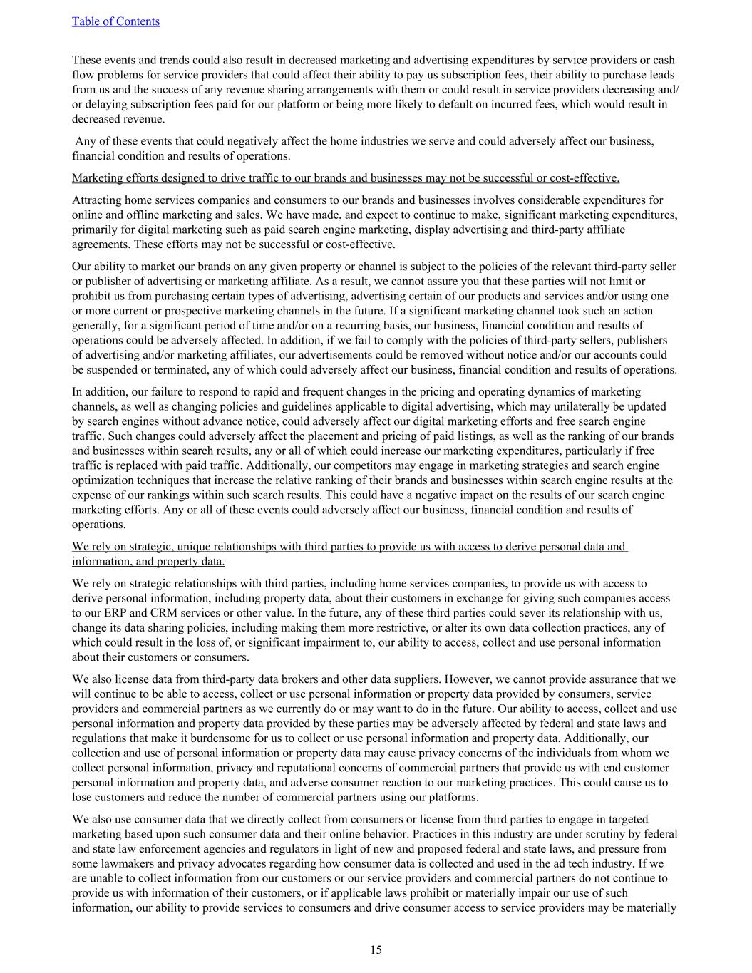 These events and trends could also result in decreased marketing and advertising expenditures by service providers or cash flow problems for service providers that could affect their ability to pay us subscription fees, their ability to purchase leads from us and the success of any revenue sharing arrangements with them or could result in service providers decreasing and/ or delaying subscription fees paid for our platform or being more likely to default on incurred fees, which would result in decreased revenue. Any of these events that could negatively affect the home industries we serve and could adversely affect our business, financial condition and results of operations. Marketing efforts designed to drive traffic to our brands and businesses may not be successful or cost-effective. Attracting home services companies and consumers to our brands and businesses involves considerable expenditures for online and offline marketing and sales. We have made, and expect to continue to make, significant marketing expenditures, primarily for digital marketing such as paid search engine marketing, display advertising and third-party affiliate agreements. These efforts may not be successful or cost-effective. Our ability to market our brands on any given property or channel is subject to the policies of the relevant third-party seller or publisher of advertising or marketing affiliate. As a result, we cannot assure you that these parties will not limit or prohibit us from purchasing certain types of advertising, advertising certain of our products and services and/or using one or more current or prospective marketing channels in the future. If a significant marketing channel took such an action generally, for a significant period of time and/or on a recurring basis, our business, financial condition and results of operations could be adversely affected. In addition, if we fail to comply with the policies of third-party sellers, publishers of advertising and/or marketing affiliates, our advertisements could be removed without notice and/or our accounts could be suspended or terminated, any of which could adversely affect our business, financial condition and results of operations. In addition, our failure to respond to rapid and frequent changes in the pricing and operating dynamics of marketing channels, as well as changing policies and guidelines applicable to digital advertising, which may unilaterally be updated by search engines without advance notice, could adversely affect our digital marketing efforts and free search engine traffic. Such changes could adversely affect the placement and pricing of paid listings, as well as the ranking of our brands and businesses within search results, any or all of which could increase our marketing expenditures, particularly if free traffic is replaced with paid traffic. Additionally, our competitors may engage in marketing strategies and search engine optimization techniques that increase the relative ranking of their brands and businesses within search engine results at the expense of our rankings within such search results. This could have a negative impact on the results of our search engine marketing efforts. Any or all of these events could adversely affect our business, financial condition and results of operations. We rely on strategic, unique relationships with third parties to provide us with access to derive personal data and information, and property data. We rely on strategic relationships with third parties, including home services companies, to provide us with access to derive personal information, including property data, about their customers in exchange for giving such companies access to our ERP and CRM services or other value. In the future, any of these third parties could sever its relationship with us, change its data sharing policies, including making them more restrictive, or alter its own data collection practices, any of which could result in the loss of, or significant impairment to, our ability to access, collect and use personal information about their customers or consumers. We also license data from third-party data brokers and other data suppliers. However, we cannot provide assurance that we will continue to be able to access, collect or use personal information or property data provided by consumers, service providers and commercial partners as we currently do or may want to do in the future. Our ability to access, collect and use personal information and property data provided by these parties may be adversely affected by federal and state laws and regulations that make it burdensome for us to collect or use personal information and property data. Additionally, our collection and use of personal information or property data may cause privacy concerns of the individuals from whom we collect personal information, privacy and reputational concerns of commercial partners that provide us with end customer personal information and property data, and adverse consumer reaction to our marketing practices. This could cause us to lose customers and reduce the number of commercial partners using our platforms. We also use consumer data that we directly collect from consumers or license from third parties to engage in targeted marketing based upon such consumer data and their online behavior. Practices in this industry are under scrutiny by federal and state law enforcement agencies and regulators in light of new and proposed federal and state laws, and pressure from some lawmakers and privacy advocates regarding how consumer data is collected and used in the ad tech industry. If we are unable to collect information from our customers or our service providers and commercial partners do not continue to provide us with information of their customers, or if applicable laws prohibit or materially impair our use of such information, our ability to provide services to consumers and drive consumer access to service providers may be materia