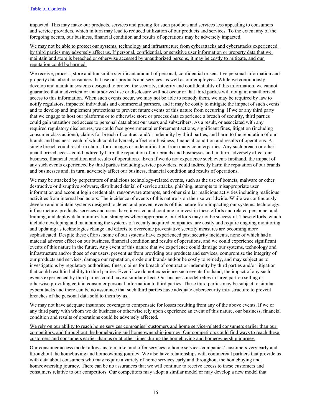 impacted. This may make our products, services and pricing for such products and services less appealing to consumers and service providers, which in turn may lead to reduced utilization of our products and services. To the extent any of the foregoing occurs, our business, financial condition and results of operations may be adversely impacted. We may not be able to protect our systems, technology and infrastructure from cyberattacks and cyberattacks experienced by third parties may adversely affect us. If personal, confidential, or sensitive user information or property data that we maintain and store is breached or otherwise accessed by unauthorized persons, it may be costly to mitigate, and our reputation could be harmed. We receive, process, store and transmit a significant amount of personal, confidential or sensitive personal information and property data about consumers that use our products and services, as well as our employees. While we continuously develop and maintain systems designed to protect the security, integrity and confidentiality of this information, we cannot guarantee that inadvertent or unauthorized use or disclosure will not occur or that third parties will not gain unauthorized access to this information. When such events occur, we may not be able to remedy them, we may be required by law to notify regulators, impacted individuals and commercial partners, and it may be costly to mitigate the impact of such events and to develop and implement protections to prevent future events of this nature from occurring. If we or any third party that we engage to host our platforms or to otherwise store or process data experience a breach of security, third parties could gain unauthorized access to personal data about our users and subscribers. As a result, or associated with any required regulatory disclosures, we could face governmental enforcement actions, significant fines, litigation (including consumer class actions), claims for breach of contract and/or indemnity by third parties, and harm to the reputation of our brands and business, each of which could adversely affect our business, financial condition and results of operations. A single breach could result in claims for damages or indemnification from many counterparties. Any such breach or other unauthorized access could indirectly harm the reputation of our brands and businesses and, in turn, adversely affect our business, financial condition and results of operations. Even if we do not experience such events firsthand, the impact of any such events experienced by third parties including service providers, could indirectly harm the reputation of our brands and businesses and, in turn, adversely affect our business, financial condition and results of operations. We may be attacked by perpetrators of malicious technology-related events, such as the use of botnets, malware or other destructive or disruptive software, distributed denial of service attacks, phishing, attempts to misappropriate user information and account login credentials, ransomware attempts, and other similar malicious activities including malicious activities from internal bad actors. The incidence of events of this nature is on the rise worldwide. While we continuously develop and maintain systems designed to detect and prevent events of this nature from impacting our systems, technology, infrastructure, products, services and users, have invested and continue to invest in these efforts and related personnel and training, and deploy data minimization strategies where appropriate, our efforts may not be successful. These efforts, which include developing and maintaining the systems of recently acquired companies, are costly and require ongoing monitoring and updating as technologies change and efforts to overcome preventative security measures are becoming more sophisticated. Despite these efforts, some of our systems have experienced past security incidents, none of which had a material adverse effect on our business, financial condition and results of operations, and we could experience significant events of this nature in the future. Any event of this nature that we experience could damage our systems, technology and infrastructure and/or those of our users, prevent us from providing our products and services, compromise the integrity of our products and services, damage our reputation, erode our brands and/or be costly to remedy, and may subject us to investigations by regulatory authorities, fines, claims for breach of contract or indemnity by third parties and/or litigation that could result in liability to third parties. Even if we do not experience such events firsthand, the impact of any such events experienced by third parties could have a similar effect. Our business model relies in large part on selling or otherwise providing certain consumer personal information to third parties. These third parties may be subject to similar cyberattacks and there can be no assurance that such third parties have adequate cybersecurity infrastructure to prevent breaches of the personal data sold to them by us. We may not have adequate insurance coverage to compensate for losses resulting from any of the above events. If we or any third party with whom we do business or otherwise rely upon experience an event of this nature, our business, financial condition and results of operations could be adversely affected. We rely on our ability to reach home services companies’ customers and home service-related consumers earlier than our competitors, and throughout the homebuying and homeownership journey. Our competitors could find ways to reach these customers and consumers earlier than us or at other times during the homebuying and homeownership journey. Our consumer access model allows us to market and offer services to home services companies’ customers very early and throughout the homebuying and homeowning journey. We also have relationships with comm