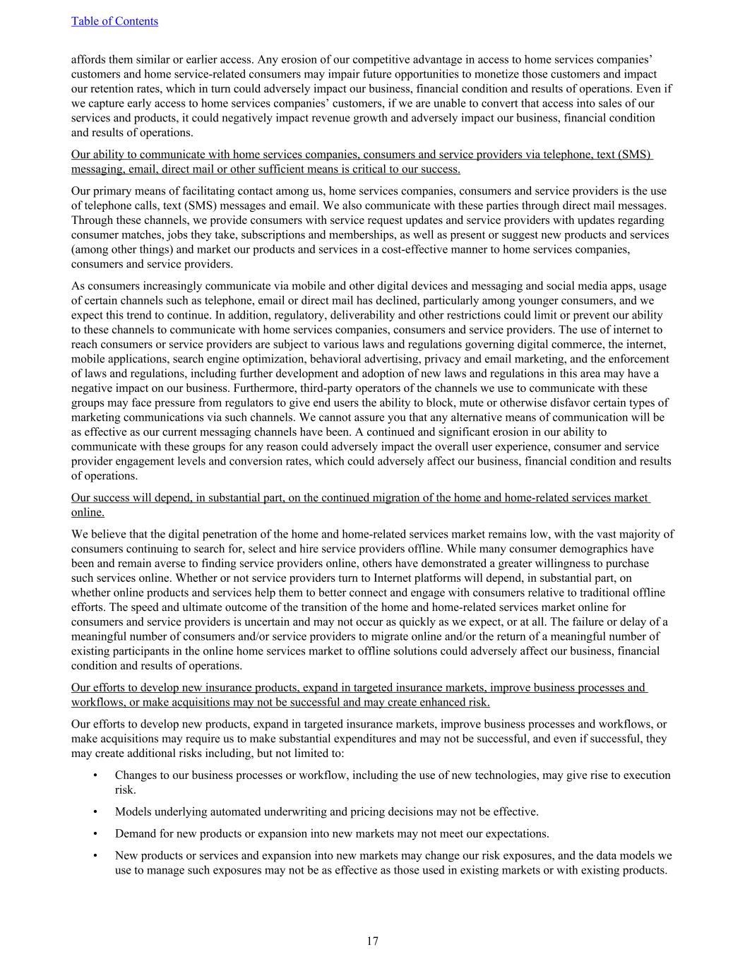 affords them similar or earlier access. Any erosion of our competitive advantage in access to home services companies’ customers and home service-related consumers may impair future opportunities to monetize those customers and impact our retention rates, which in turn could adversely impact our business, financial condition and results of operations. Even if we capture early access to home services companies’ customers, if we are unable to convert that access into sales of our services and products, it could negatively impact revenue growth and adversely impact our business, financial condition and results of operations. Our ability to communicate with home services companies, consumers and service providers via telephone, text (SMS) messaging, email, direct mail or other sufficient means is critical to our success. Our primary means of facilitating contact among us, home services companies, consumers and service providers is the use of telephone calls, text (SMS) messages and email. We also communicate with these parties through direct mail messages. Through these channels, we provide consumers with service request updates and service providers with updates regarding consumer matches, jobs they take, subscriptions and memberships, as well as present or suggest new products and services (among other things) and market our products and services in a cost-effective manner to home services companies, consumers and service providers. As consumers increasingly communicate via mobile and other digital devices and messaging and social media apps, usage of certain channels such as telephone, email or direct mail has declined, particularly among younger consumers, and we expect this trend to continue. In addition, regulatory, deliverability and other restrictions could limit or prevent our ability to these channels to communicate with home services companies, consumers and service providers. The use of internet to reach consumers or service providers are subject to various laws and regulations governing digital commerce, the internet, mobile applications, search engine optimization, behavioral advertising, privacy and email marketing, and the enforcement of laws and regulations, including further development and adoption of new laws and regulations in this area may have a negative impact on our business. Furthermore, third-party operators of the channels we use to communicate with these groups may face pressure from regulators to give end users the ability to block, mute or otherwise disfavor certain types of marketing communications via such channels. We cannot assure you that any alternative means of communication will be as effective as our current messaging channels have been. A continued and significant erosion in our ability to communicate with these groups for any reason could adversely impact the overall user experience, consumer and service provider engagement levels and conversion rates, which could adversely affect our business, financial condition and results of operations. Our success will depend, in substantial part, on the continued migration of the home and home-related services market online. We believe that the digital penetration of the home and home-related services market remains low, with the vast majority of consumers continuing to search for, select and hire service providers offline. While many consumer demographics have been and remain averse to finding service providers online, others have demonstrated a greater willingness to purchase such services online. Whether or not service providers turn to Internet platforms will depend, in substantial part, on whether online products and services help them to better connect and engage with consumers relative to traditional offline efforts. The speed and ultimate outcome of the transition of the home and home-related services market online for consumers and service providers is uncertain and may not occur as quickly as we expect, or at all. The failure or delay of a meaningful number of consumers and/or service providers to migrate online and/or the return of a meaningful number of existing participants in the online home services market to offline solutions could adversely affect our business, financial condition and results of operations. Our efforts to develop new insurance products, expand in targeted insurance markets, improve business processes and workflows, or make acquisitions may not be successful and may create enhanced risk. Our efforts to develop new products, expand in targeted insurance markets, improve business processes and workflows, or make acquisitions may require us to make substantial expenditures and may not be successful, and even if successful, they may create additional risks including, but not limited to: • Changes to our business processes or workflow, including the use of new technologies, may give rise to execution risk. • Models underlying automated underwriting and pricing decisions may not be effective. • Demand for new products or expansion into new markets may not meet our expectations. • New products or services and expansion into new markets may change our risk exposures, and the data models we use to manage such exposures may not be as effective as those used in existing markets or with existing products. Table of Contents 17