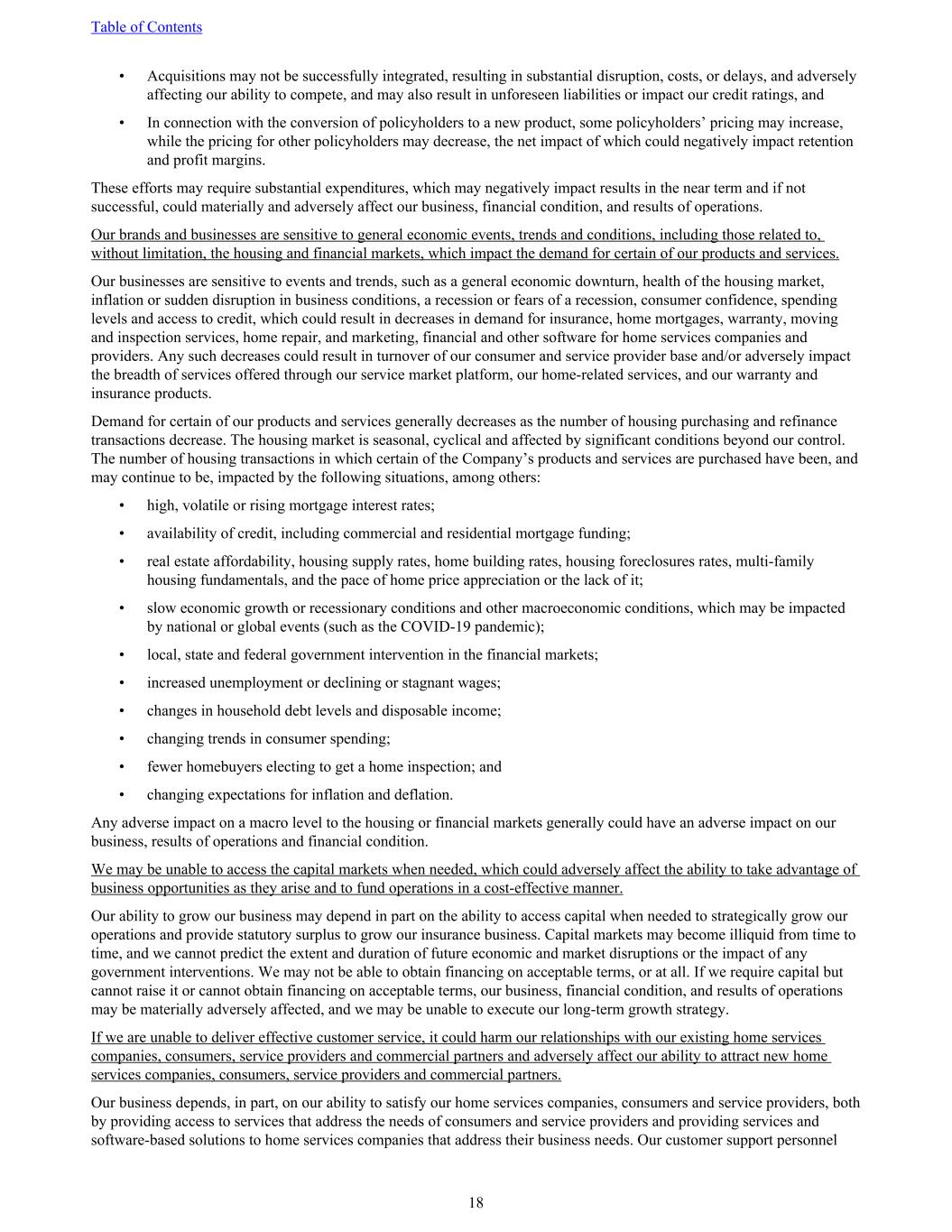 • Acquisitions may not be successfully integrated, resulting in substantial disruption, costs, or delays, and adversely affecting our ability to compete, and may also result in unforeseen liabilities or impact our credit ratings, and • In connection with the conversion of policyholders to a new product, some policyholders’ pricing may increase, while the pricing for other policyholders may decrease, the net impact of which could negatively impact retention and profit margins. These efforts may require substantial expenditures, which may negatively impact results in the near term and if not successful, could materially and adversely affect our business, financial condition, and results of operations. Our brands and businesses are sensitive to general economic events, trends and conditions, including those related to, without limitation, the housing and financial markets, which impact the demand for certain of our products and services. Our businesses are sensitive to events and trends, such as a general economic downturn, health of the housing market, inflation or sudden disruption in business conditions, a recession or fears of a recession, consumer confidence, spending levels and access to credit, which could result in decreases in demand for insurance, home mortgages, warranty, moving and inspection services, home repair, and marketing, financial and other software for home services companies and providers. Any such decreases could result in turnover of our consumer and service provider base and/or adversely impact the breadth of services offered through our service market platform, our home-related services, and our warranty and insurance products. Demand for certain of our products and services generally decreases as the number of housing purchasing and refinance transactions decrease. The housing market is seasonal, cyclical and affected by significant conditions beyond our control. The number of housing transactions in which certain of the Company’s products and services are purchased have been, and may continue to be, impacted by the following situations, among others: • high, volatile or rising mortgage interest rates; • availability of credit, including commercial and residential mortgage funding; • real estate affordability, housing supply rates, home building rates, housing foreclosures rates, multi-family housing fundamentals, and the pace of home price appreciation or the lack of it; • slow economic growth or recessionary conditions and other macroeconomic conditions, which may be impacted by national or global events (such as the COVID-19 pandemic); • local, state and federal government intervention in the financial markets; • increased unemployment or declining or stagnant wages; • changes in household debt levels and disposable income; • changing trends in consumer spending; • fewer homebuyers electing to get a home inspection; and • changing expectations for inflation and deflation. Any adverse impact on a macro level to the housing or financial markets generally could have an adverse impact on our business, results of operations and financial condition. We may be unable to access the capital markets when needed, which could adversely affect the ability to take advantage of business opportunities as they arise and to fund operations in a cost-effective manner. Our ability to grow our business may depend in part on the ability to access capital when needed to strategically grow our operations and provide statutory surplus to grow our insurance business. Capital markets may become illiquid from time to time, and we cannot predict the extent and duration of future economic and market disruptions or the impact of any government interventions. We may not be able to obtain financing on acceptable terms, or at all. If we require capital but cannot raise it or cannot obtain financing on acceptable terms, our business, financial condition, and results of operations may be materially adversely affected, and we may be unable to execute our long-term growth strategy. If we are unable to deliver effective customer service, it could harm our relationships with our existing home services companies, consumers, service providers and commercial partners and adversely affect our ability to attract new home services companies, consumers, service providers and commercial partners. Our business depends, in part, on our ability to satisfy our home services companies, consumers and service providers, both by providing access to services that address the needs of consumers and service providers and providing services and software-based solutions to home services companies that address their business needs. Our customer support personnel Table of Contents 18
