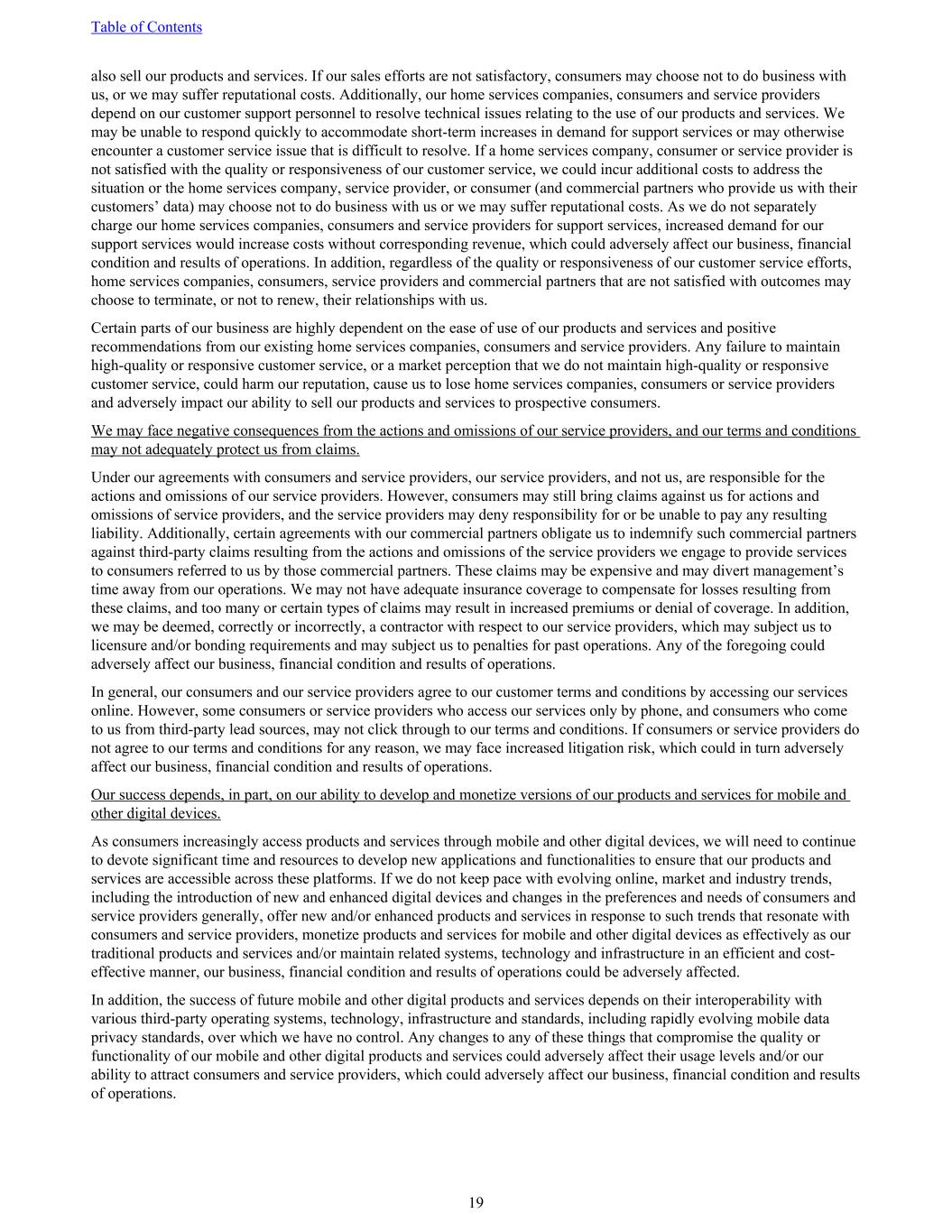 also sell our products and services. If our sales efforts are not satisfactory, consumers may choose not to do business with us, or we may suffer reputational costs. Additionally, our home services companies, consumers and service providers depend on our customer support personnel to resolve technical issues relating to the use of our products and services. We may be unable to respond quickly to accommodate short-term increases in demand for support services or may otherwise encounter a customer service issue that is difficult to resolve. If a home services company, consumer or service provider is not satisfied with the quality or responsiveness of our customer service, we could incur additional costs to address the situation or the home services company, service provider, or consumer (and commercial partners who provide us with their customers’ data) may choose not to do business with us or we may suffer reputational costs. As we do not separately charge our home services companies, consumers and service providers for support services, increased demand for our support services would increase costs without corresponding revenue, which could adversely affect our business, financial condition and results of operations. In addition, regardless of the quality or responsiveness of our customer service efforts, home services companies, consumers, service providers and commercial partners that are not satisfied with outcomes may choose to terminate, or not to renew, their relationships with us. Certain parts of our business are highly dependent on the ease of use of our products and services and positive recommendations from our existing home services companies, consumers and service providers. Any failure to maintain high-quality or responsive customer service, or a market perception that we do not maintain high-quality or responsive customer service, could harm our reputation, cause us to lose home services companies, consumers or service providers and adversely impact our ability to sell our products and services to prospective consumers. We may face negative consequences from the actions and omissions of our service providers, and our terms and conditions may not adequately protect us from claims. Under our agreements with consumers and service providers, our service providers, and not us, are responsible for the actions and omissions of our service providers. However, consumers may still bring claims against us for actions and omissions of service providers, and the service providers may deny responsibility for or be unable to pay any resulting liability. Additionally, certain agreements with our commercial partners obligate us to indemnify such commercial partners against third-party claims resulting from the actions and omissions of the service providers we engage to provide services to consumers referred to us by those commercial partners. These claims may be expensive and may divert management’s time away from our operations. We may not have adequate insurance coverage to compensate for losses resulting from these claims, and too many or certain types of claims may result in increased premiums or denial of coverage. In addition, we may be deemed, correctly or incorrectly, a contractor with respect to our service providers, which may subject us to licensure and/or bonding requirements and may subject us to penalties for past operations. Any of the foregoing could adversely affect our business, financial condition and results of operations. In general, our consumers and our service providers agree to our customer terms and conditions by accessing our services online. However, some consumers or service providers who access our services only by phone, and consumers who come to us from third-party lead sources, may not click through to our terms and conditions. If consumers or service providers do not agree to our terms and conditions for any reason, we may face increased litigation risk, which could in turn adversely affect our business, financial condition and results of operations. Our success depends, in part, on our ability to develop and monetize versions of our products and services for mobile and other digital devices. As consumers increasingly access products and services through mobile and other digital devices, we will need to continue to devote significant time and resources to develop new applications and functionalities to ensure that our products and services are accessible across these platforms. If we do not keep pace with evolving online, market and industry trends, including the introduction of new and enhanced digital devices and changes in the preferences and needs of consumers and service providers generally, offer new and/or enhanced products and services in response to such trends that resonate with consumers and service providers, monetize products and services for mobile and other digital devices as effectively as our traditional products and services and/or maintain related systems, technology and infrastructure in an efficient and cost- effective manner, our business, financial condition and results of operations could be adversely affected. In addition, the success of future mobile and other digital products and services depends on their interoperability with various third-party operating systems, technology, infrastructure and standards, including rapidly evolving mobile data privacy standards, over which we have no control. Any changes to any of these things that compromise the quality or functionality of our mobile and other digital products and services could adversely affect their usage levels and/or our ability to attract consumers and service providers, which could adversely affect our business, financial condition and results of operations. Table of Contents 19