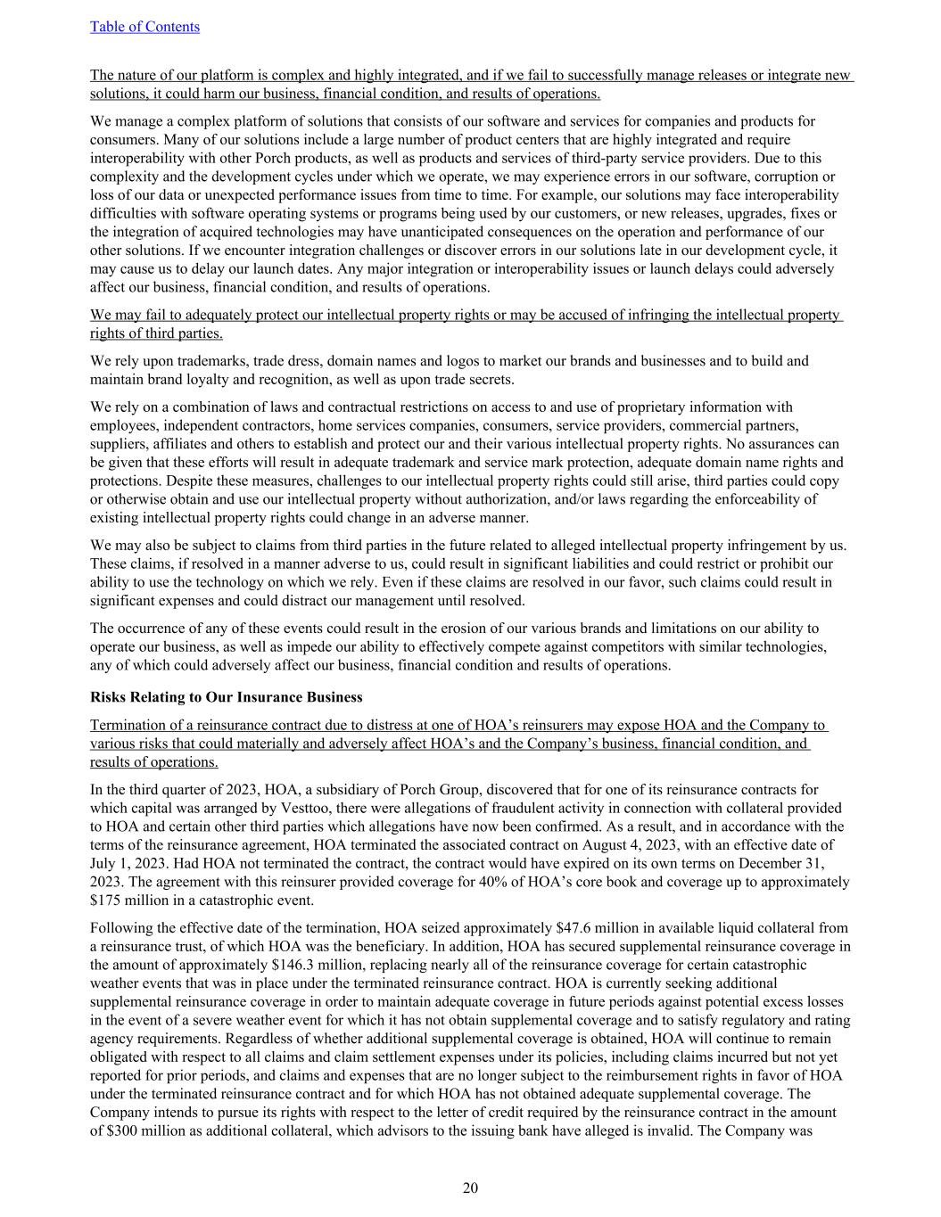 The nature of our platform is complex and highly integrated, and if we fail to successfully manage releases or integrate new solutions, it could harm our business, financial condition, and results of operations. We manage a complex platform of solutions that consists of our software and services for companies and products for consumers. Many of our solutions include a large number of product centers that are highly integrated and require interoperability with other Porch products, as well as products and services of third-party service providers. Due to this complexity and the development cycles under which we operate, we may experience errors in our software, corruption or loss of our data or unexpected performance issues from time to time. For example, our solutions may face interoperability difficulties with software operating systems or programs being used by our customers, or new releases, upgrades, fixes or the integration of acquired technologies may have unanticipated consequences on the operation and performance of our other solutions. If we encounter integration challenges or discover errors in our solutions late in our development cycle, it may cause us to delay our launch dates. Any major integration or interoperability issues or launch delays could adversely affect our business, financial condition, and results of operations. We may fail to adequately protect our intellectual property rights or may be accused of infringing the intellectual property rights of third parties. We rely upon trademarks, trade dress, domain names and logos to market our brands and businesses and to build and maintain brand loyalty and recognition, as well as upon trade secrets. We rely on a combination of laws and contractual restrictions on access to and use of proprietary information with employees, independent contractors, home services companies, consumers, service providers, commercial partners, suppliers, affiliates and others to establish and protect our and their various intellectual property rights. No assurances can be given that these efforts will result in adequate trademark and service mark protection, adequate domain name rights and protections. Despite these measures, challenges to our intellectual property rights could still arise, third parties could copy or otherwise obtain and use our intellectual property without authorization, and/or laws regarding the enforceability of existing intellectual property rights could change in an adverse manner. We may also be subject to claims from third parties in the future related to alleged intellectual property infringement by us. These claims, if resolved in a manner adverse to us, could result in significant liabilities and could restrict or prohibit our ability to use the technology on which we rely. Even if these claims are resolved in our favor, such claims could result in significant expenses and could distract our management until resolved. The occurrence of any of these events could result in the erosion of our various brands and limitations on our ability to operate our business, as well as impede our ability to effectively compete against competitors with similar technologies, any of which could adversely affect our business, financial condition and results of operations. Risks Relating to Our Insurance Business Termination of a reinsurance contract due to distress at one of HOA’s reinsurers may expose HOA and the Company to various risks that could materially and adversely affect HOA’s and the Company’s business, financial condition, and results of operations. In the third quarter of 2023, HOA, a subsidiary of Porch Group, discovered that for one of its reinsurance contracts for which capital was arranged by Vesttoo, there were allegations of fraudulent activity in connection with collateral provided to HOA and certain other third parties which allegations have now been confirmed. As a result, and in accordance with the terms of the reinsurance agreement, HOA terminated the associated contract on August 4, 2023, with an effective date of July 1, 2023. Had HOA not terminated the contract, the contract would have expired on its own terms on December 31, 2023. The agreement with this reinsurer provided coverage for 40% of HOA’s core book and coverage up to approximately $175 million in a catastrophic event. Following the effective date of the termination, HOA seized approximately $47.6 million in available liquid collateral from a reinsurance trust, of which HOA was the beneficiary. In addition, HOA has secured supplemental reinsurance coverage in the amount of approximately $146.3 million, replacing nearly all of the reinsurance coverage for certain catastrophic weather events that was in place under the terminated reinsurance contract. HOA is currently seeking additional supplemental reinsurance coverage in order to maintain adequate coverage in future periods against potential excess losses in the event of a severe weather event for which it has not obtain supplemental coverage and to satisfy regulatory and rating agency requirements. Regardless of whether additional supplemental coverage is obtained, HOA will continue to remain obligated with respect to all claims and claim settlement expenses under its policies, including claims incurred but not yet reported for prior periods, and claims and expenses that are no longer subject to the reimbursement rights in favor of HOA under the terminated reinsurance contract and for which HOA has not obtained adequate supplemental coverage. The Company intends to pursue its rights with respect to the letter of credit required by the reinsurance contract in the amount of $300 million as additional collateral, which advisors to the issuing bank have alleged is invalid. The Company was Table of Contents 20