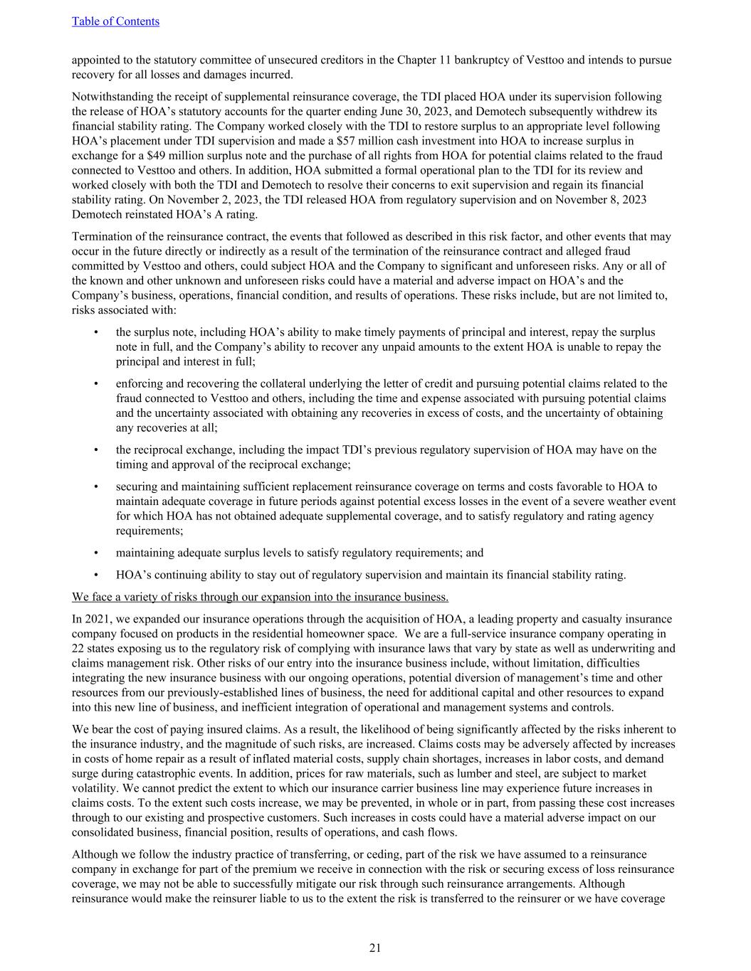appointed to the statutory committee of unsecured creditors in the Chapter 11 bankruptcy of Vesttoo and intends to pursue recovery for all losses and damages incurred. Notwithstanding the receipt of supplemental reinsurance coverage, the TDI placed HOA under its supervision following the release of HOA’s statutory accounts for the quarter ending June 30, 2023, and Demotech subsequently withdrew its financial stability rating. The Company worked closely with the TDI to restore surplus to an appropriate level following HOA’s placement under TDI supervision and made a $57 million cash investment into HOA to increase surplus in exchange for a $49 million surplus note and the purchase of all rights from HOA for potential claims related to the fraud connected to Vesttoo and others. In addition, HOA submitted a formal operational plan to the TDI for its review and worked closely with both the TDI and Demotech to resolve their concerns to exit supervision and regain its financial stability rating. On November 2, 2023, the TDI released HOA from regulatory supervision and on November 8, 2023 Demotech reinstated HOA’s A rating. Termination of the reinsurance contract, the events that followed as described in this risk factor, and other events that may occur in the future directly or indirectly as a result of the termination of the reinsurance contract and alleged fraud committed by Vesttoo and others, could subject HOA and the Company to significant and unforeseen risks. Any or all of the known and other unknown and unforeseen risks could have a material and adverse impact on HOA’s and the Company’s business, operations, financial condition, and results of operations. These risks include, but are not limited to, risks associated with: • the surplus note, including HOA’s ability to make timely payments of principal and interest, repay the surplus note in full, and the Company’s ability to recover any unpaid amounts to the extent HOA is unable to repay the principal and interest in full; • enforcing and recovering the collateral underlying the letter of credit and pursuing potential claims related to the fraud connected to Vesttoo and others, including the time and expense associated with pursuing potential claims and the uncertainty associated with obtaining any recoveries in excess of costs, and the uncertainty of obtaining any recoveries at all; • the reciprocal exchange, including the impact TDI’s previous regulatory supervision of HOA may have on the timing and approval of the reciprocal exchange; • securing and maintaining sufficient replacement reinsurance coverage on terms and costs favorable to HOA to maintain adequate coverage in future periods against potential excess losses in the event of a severe weather event for which HOA has not obtained adequate supplemental coverage, and to satisfy regulatory and rating agency requirements; • maintaining adequate surplus levels to satisfy regulatory requirements; and • HOA’s continuing ability to stay out of regulatory supervision and maintain its financial stability rating. We face a variety of risks through our expansion into the insurance business. In 2021, we expanded our insurance operations through the acquisition of HOA, a leading property and casualty insurance company focused on products in the residential homeowner space. We are a full-service insurance company operating in 22 states exposing us to the regulatory risk of complying with insurance laws that vary by state as well as underwriting and claims management risk. Other risks of our entry into the insurance business include, without limitation, difficulties integrating the new insurance business with our ongoing operations, potential diversion of management’s time and other resources from our previously-established lines of business, the need for additional capital and other resources to expand into this new line of business, and inefficient integration of operational and management systems and controls. We bear the cost of paying insured claims. As a result, the likelihood of being significantly affected by the risks inherent to the insurance industry, and the magnitude of such risks, are increased. Claims costs may be adversely affected by increases in costs of home repair as a result of inflated material costs, supply chain shortages, increases in labor costs, and demand surge during catastrophic events. In addition, prices for raw materials, such as lumber and steel, are subject to market volatility. We cannot predict the extent to which our insurance carrier business line may experience future increases in claims costs. To the extent such costs increase, we may be prevented, in whole or in part, from passing these cost increases through to our existing and prospective customers. Such increases in costs could have a material adverse impact on our consolidated business, financial position, results of operations, and cash flows. Although we follow the industry practice of transferring, or ceding, part of the risk we have assumed to a reinsurance company in exchange for part of the premium we receive in connection with the risk or securing excess of loss reinsurance coverage, we may not be able to successfully mitigate our risk through such reinsurance arrangements. Although reinsurance would make the reinsurer liable to us to the extent the risk is transferred to the reinsurer or we have coverage Table of Contents 21
