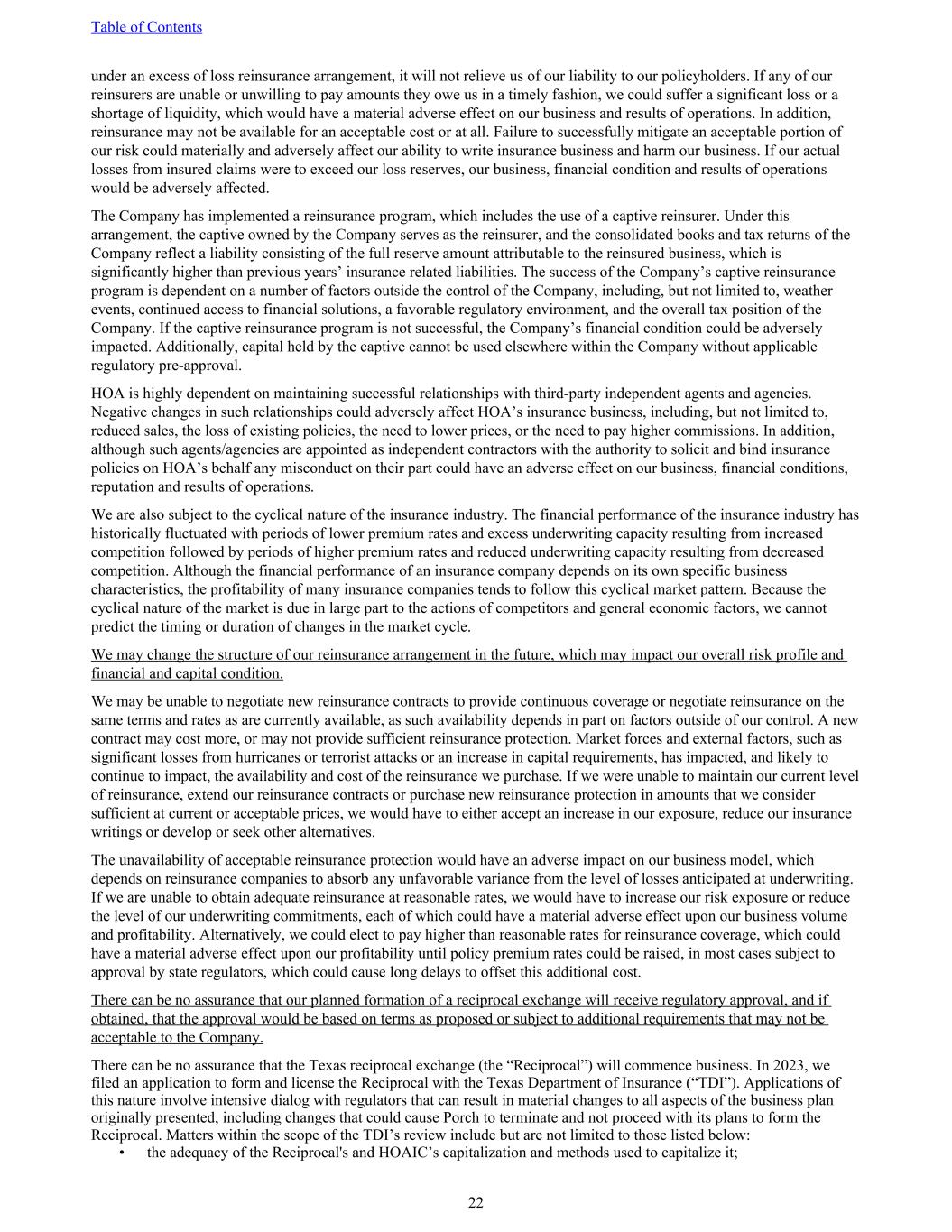 under an excess of loss reinsurance arrangement, it will not relieve us of our liability to our policyholders. If any of our reinsurers are unable or unwilling to pay amounts they owe us in a timely fashion, we could suffer a significant loss or a shortage of liquidity, which would have a material adverse effect on our business and results of operations. In addition, reinsurance may not be available for an acceptable cost or at all. Failure to successfully mitigate an acceptable portion of our risk could materially and adversely affect our ability to write insurance business and harm our business. If our actual losses from insured claims were to exceed our loss reserves, our business, financial condition and results of operations would be adversely affected. The Company has implemented a reinsurance program, which includes the use of a captive reinsurer. Under this arrangement, the captive owned by the Company serves as the reinsurer, and the consolidated books and tax returns of the Company reflect a liability consisting of the full reserve amount attributable to the reinsured business, which is significantly higher than previous years’ insurance related liabilities. The success of the Company’s captive reinsurance program is dependent on a number of factors outside the control of the Company, including, but not limited to, weather events, continued access to financial solutions, a favorable regulatory environment, and the overall tax position of the Company. If the captive reinsurance program is not successful, the Company’s financial condition could be adversely impacted. Additionally, capital held by the captive cannot be used elsewhere within the Company without applicable regulatory pre-approval. HOA is highly dependent on maintaining successful relationships with third-party independent agents and agencies. Negative changes in such relationships could adversely affect HOA’s insurance business, including, but not limited to, reduced sales, the loss of existing policies, the need to lower prices, or the need to pay higher commissions. In addition, although such agents/agencies are appointed as independent contractors with the authority to solicit and bind insurance policies on HOA’s behalf any misconduct on their part could have an adverse effect on our business, financial conditions, reputation and results of operations. We are also subject to the cyclical nature of the insurance industry. The financial performance of the insurance industry has historically fluctuated with periods of lower premium rates and excess underwriting capacity resulting from increased competition followed by periods of higher premium rates and reduced underwriting capacity resulting from decreased competition. Although the financial performance of an insurance company depends on its own specific business characteristics, the profitability of many insurance companies tends to follow this cyclical market pattern. Because the cyclical nature of the market is due in large part to the actions of competitors and general economic factors, we cannot predict the timing or duration of changes in the market cycle. We may change the structure of our reinsurance arrangement in the future, which may impact our overall risk profile and financial and capital condition. We may be unable to negotiate new reinsurance contracts to provide continuous coverage or negotiate reinsurance on the same terms and rates as are currently available, as such availability depends in part on factors outside of our control. A new contract may cost more, or may not provide sufficient reinsurance protection. Market forces and external factors, such as significant losses from hurricanes or terrorist attacks or an increase in capital requirements, has impacted, and likely to continue to impact, the availability and cost of the reinsurance we purchase. If we were unable to maintain our current level of reinsurance, extend our reinsurance contracts or purchase new reinsurance protection in amounts that we consider sufficient at current or acceptable prices, we would have to either accept an increase in our exposure, reduce our insurance writings or develop or seek other alternatives. The unavailability of acceptable reinsurance protection would have an adverse impact on our business model, which depends on reinsurance companies to absorb any unfavorable variance from the level of losses anticipated at underwriting. If we are unable to obtain adequate reinsurance at reasonable rates, we would have to increase our risk exposure or reduce the level of our underwriting commitments, each of which could have a material adverse effect upon our business volume and profitability. Alternatively, we could elect to pay higher than reasonable rates for reinsurance coverage, which could have a material adverse effect upon our profitability until policy premium rates could be raised, in most cases subject to approval by state regulators, which could cause long delays to offset this additional cost. There can be no assurance that our planned formation of a reciprocal exchange will receive regulatory approval, and if obtained, that the approval would be based on terms as proposed or subject to additional requirements that may not be acceptable to the Company. There can be no assurance that the Texas reciprocal exchange (the “Reciprocal”) will commence business. In 2023, we filed an application to form and license the Reciprocal with the Texas Department of Insurance (“TDI”). Applications of this nature involve intensive dialog with regulators that can result in material changes to all aspects of the business plan originally presented, including changes that could cause Porch to terminate and not proceed with its plans to form the Reciprocal. Matters within the scope of the TDI’s review include but are not limited to those listed below: • the adequacy of the Reciprocal's and HOAIC’s capitalization and methods used to capitalize it; Table of 