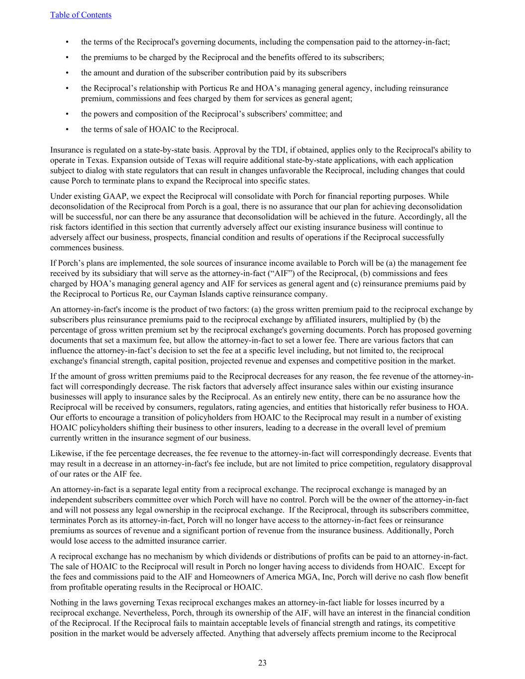 • the terms of the Reciprocal's governing documents, including the compensation paid to the attorney-in-fact; • the premiums to be charged by the Reciprocal and the benefits offered to its subscribers; • the amount and duration of the subscriber contribution paid by its subscribers • the Reciprocal’s relationship with Porticus Re and HOA’s managing general agency, including reinsurance premium, commissions and fees charged by them for services as general agent; • the powers and composition of the Reciprocal’s subscribers' committee; and • the terms of sale of HOAIC to the Reciprocal. Insurance is regulated on a state-by-state basis. Approval by the TDI, if obtained, applies only to the Reciprocal's ability to operate in Texas. Expansion outside of Texas will require additional state-by-state applications, with each application subject to dialog with state regulators that can result in changes unfavorable the Reciprocal, including changes that could cause Porch to terminate plans to expand the Reciprocal into specific states. Under existing GAAP, we expect the Reciprocal will consolidate with Porch for financial reporting purposes. While deconsolidation of the Reciprocal from Porch is a goal, there is no assurance that our plan for achieving deconsolidation will be successful, nor can there be any assurance that deconsolidation will be achieved in the future. Accordingly, all the risk factors identified in this section that currently adversely affect our existing insurance business will continue to adversely affect our business, prospects, financial condition and results of operations if the Reciprocal successfully commences business. If Porch’s plans are implemented, the sole sources of insurance income available to Porch will be (a) the management fee received by its subsidiary that will serve as the attorney-in-fact (“AIF”) of the Reciprocal, (b) commissions and fees charged by HOA’s managing general agency and AIF for services as general agent and (c) reinsurance premiums paid by the Reciprocal to Porticus Re, our Cayman Islands captive reinsurance company. An attorney-in-fact's income is the product of two factors: (a) the gross written premium paid to the reciprocal exchange by subscribers plus reinsurance premiums paid to the reciprocal exchange by affiliated insurers, multiplied by (b) the percentage of gross written premium set by the reciprocal exchange's governing documents. Porch has proposed governing documents that set a maximum fee, but allow the attorney-in-fact to set a lower fee. There are various factors that can influence the attorney-in-fact’s decision to set the fee at a specific level including, but not limited to, the reciprocal exchange's financial strength, capital position, projected revenue and expenses and competitive position in the market. If the amount of gross written premiums paid to the Reciprocal decreases for any reason, the fee revenue of the attorney-in- fact will correspondingly decrease. The risk factors that adversely affect insurance sales within our existing insurance businesses will apply to insurance sales by the Reciprocal. As an entirely new entity, there can be no assurance how the Reciprocal will be received by consumers, regulators, rating agencies, and entities that historically refer business to HOA. Our efforts to encourage a transition of policyholders from HOAIC to the Reciprocal may result in a number of existing HOAIC policyholders shifting their business to other insurers, leading to a decrease in the overall level of premium currently written in the insurance segment of our business. Likewise, if the fee percentage decreases, the fee revenue to the attorney-in-fact will correspondingly decrease. Events that may result in a decrease in an attorney-in-fact's fee include, but are not limited to price competition, regulatory disapproval of our rates or the AIF fee. An attorney-in-fact is a separate legal entity from a reciprocal exchange. The reciprocal exchange is managed by an independent subscribers committee over which Porch will have no control. Porch will be the owner of the attorney-in-fact and will not possess any legal ownership in the reciprocal exchange. If the Reciprocal, through its subscribers committee, terminates Porch as its attorney-in-fact, Porch will no longer have access to the attorney-in-fact fees or reinsurance premiums as sources of revenue and a significant portion of revenue from the insurance business. Additionally, Porch would lose access to the admitted insurance carrier. A reciprocal exchange has no mechanism by which dividends or distributions of profits can be paid to an attorney-in-fact. The sale of HOAIC to the Reciprocal will result in Porch no longer having access to dividends from HOAIC. Except for the fees and commissions paid to the AIF and Homeowners of America MGA, Inc, Porch will derive no cash flow benefit from profitable operating results in the Reciprocal or HOAIC. Nothing in the laws governing Texas reciprocal exchanges makes an attorney-in-fact liable for losses incurred by a reciprocal exchange. Nevertheless, Porch, through its ownership of the AIF, will have an interest in the financial condition of the Reciprocal. If the Reciprocal fails to maintain acceptable levels of financial strength and ratings, its competitive position in the market would be adversely affected. Anything that adversely affects premium income to the Reciprocal Table of Contents 23