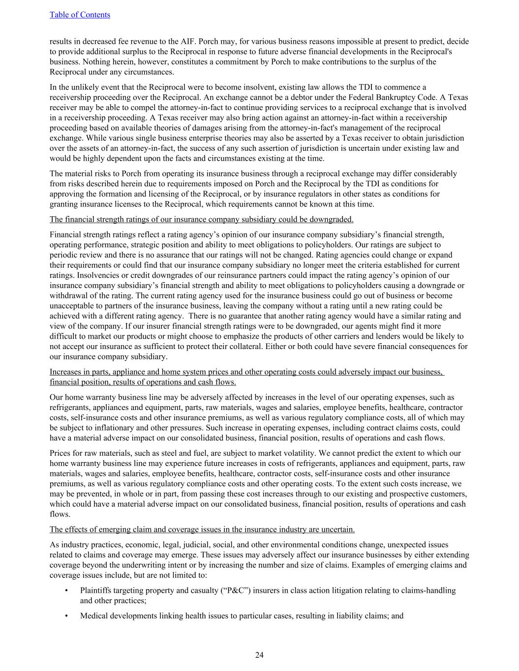 results in decreased fee revenue to the AIF. Porch may, for various business reasons impossible at present to predict, decide to provide additional surplus to the Reciprocal in response to future adverse financial developments in the Reciprocal's business. Nothing herein, however, constitutes a commitment by Porch to make contributions to the surplus of the Reciprocal under any circumstances. In the unlikely event that the Reciprocal were to become insolvent, existing law allows the TDI to commence a receivership proceeding over the Reciprocal. An exchange cannot be a debtor under the Federal Bankruptcy Code. A Texas receiver may be able to compel the attorney-in-fact to continue providing services to a reciprocal exchange that is involved in a receivership proceeding. A Texas receiver may also bring action against an attorney-in-fact within a receivership proceeding based on available theories of damages arising from the attorney-in-fact's management of the reciprocal exchange. While various single business enterprise theories may also be asserted by a Texas receiver to obtain jurisdiction over the assets of an attorney-in-fact, the success of any such assertion of jurisdiction is uncertain under existing law and would be highly dependent upon the facts and circumstances existing at the time. The material risks to Porch from operating its insurance business through a reciprocal exchange may differ considerably from risks described herein due to requirements imposed on Porch and the Reciprocal by the TDI as conditions for approving the formation and licensing of the Reciprocal, or by insurance regulators in other states as conditions for granting insurance licenses to the Reciprocal, which requirements cannot be known at this time. The financial strength ratings of our insurance company subsidiary could be downgraded. Financial strength ratings reflect a rating agency’s opinion of our insurance company subsidiary’s financial strength, operating performance, strategic position and ability to meet obligations to policyholders. Our ratings are subject to periodic review and there is no assurance that our ratings will not be changed. Rating agencies could change or expand their requirements or could find that our insurance company subsidiary no longer meet the criteria established for current ratings. Insolvencies or credit downgrades of our reinsurance partners could impact the rating agency’s opinion of our insurance company subsidiary’s financial strength and ability to meet obligations to policyholders causing a downgrade or withdrawal of the rating. The current rating agency used for the insurance business could go out of business or become unacceptable to partners of the insurance business, leaving the company without a rating until a new rating could be achieved with a different rating agency. There is no guarantee that another rating agency would have a similar rating and view of the company. If our insurer financial strength ratings were to be downgraded, our agents might find it more difficult to market our products or might choose to emphasize the products of other carriers and lenders would be likely to not accept our insurance as sufficient to protect their collateral. Either or both could have severe financial consequences for our insurance company subsidiary. Increases in parts, appliance and home system prices and other operating costs could adversely impact our business, financial position, results of operations and cash flows. Our home warranty business line may be adversely affected by increases in the level of our operating expenses, such as refrigerants, appliances and equipment, parts, raw materials, wages and salaries, employee benefits, healthcare, contractor costs, self-insurance costs and other insurance premiums, as well as various regulatory compliance costs, all of which may be subject to inflationary and other pressures. Such increase in operating expenses, including contract claims costs, could have a material adverse impact on our consolidated business, financial position, results of operations and cash flows. Prices for raw materials, such as steel and fuel, are subject to market volatility. We cannot predict the extent to which our home warranty business line may experience future increases in costs of refrigerants, appliances and equipment, parts, raw materials, wages and salaries, employee benefits, healthcare, contractor costs, self-insurance costs and other insurance premiums, as well as various regulatory compliance costs and other operating costs. To the extent such costs increase, we may be prevented, in whole or in part, from passing these cost increases through to our existing and prospective customers, which could have a material adverse impact on our consolidated business, financial position, results of operations and cash flows. The effects of emerging claim and coverage issues in the insurance industry are uncertain. As industry practices, economic, legal, judicial, social, and other environmental conditions change, unexpected issues related to claims and coverage may emerge. These issues may adversely affect our insurance businesses by either extending coverage beyond the underwriting intent or by increasing the number and size of claims. Examples of emerging claims and coverage issues include, but are not limited to: • Plaintiffs targeting property and casualty (“P&C”) insurers in class action litigation relating to claims-handling and other practices; • Medical developments linking health issues to particular cases, resulting in liability claims; and Table of Contents 24