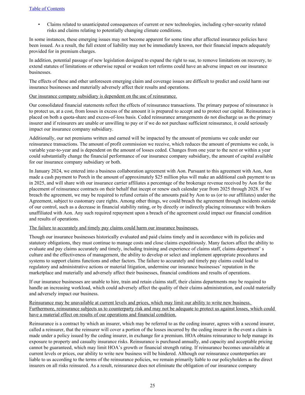• Claims related to unanticipated consequences of current or new technologies, including cyber-security related risks and claims relating to potentially changing climate conditions. In some instances, these emerging issues may not become apparent for some time after affected insurance policies have been issued. As a result, the full extent of liability may not be immediately known, nor their financial impacts adequately provided for in premium charges. In addition, potential passage of new legislation designed to expand the right to sue, to remove limitations on recovery, to extend statutes of limitations or otherwise repeal or weaken tort reforms could have an adverse impact on our insurance businesses. The effects of these and other unforeseen emerging claim and coverage issues are difficult to predict and could harm our insurance businesses and materially adversely affect their results and operations. Our insurance company subsidiary is dependent on the use of reinsurance. Our consolidated financial statements reflect the effects of reinsurance transactions. The primary purpose of reinsurance is to protect us, at a cost, from losses in excess of the amount it is prepared to accept and to protect our capital. Reinsurance is placed on both a quota-share and excess-of-loss basis. Ceded reinsurance arrangements do not discharge us as the primary insurer and if reinsurers are unable or unwilling to pay or if we do not purchase sufficient reinsurance, it could seriously impact our insurance company subsidiary. Additionally, our net premiums written and earned will be impacted by the amount of premiums we cede under our reinsurance transactions. The amount of profit commission we receive, which reduces the amount of premiums we cede, is variable year-to-year and is dependent on the amount of losses ceded. Changes from one year to the next or within a year could substantially change the financial performance of our insurance company subsidiary, the amount of capital available for our insurance company subsidiary or both. In January 2024, we entered into a business collaboration agreement with Aon. Pursuant to this agreement with Aon, Aon made a cash payment to Porch in the amount of approximately $25 million plus will make an additional cash payment to us in 2025, and will share with our insurance carrier affiliates a percentage of the brokerage revenue received by Aon for the placement of reinsurance contracts on their behalf that incept or renew each calendar year from 2025 through 2028. If we breach the agreement, we may be required to refund certain of the amounts paid by Aon to us (or to our affiliates) under the Agreement, subject to customary cure rights. Among other things, we could breach the agreement through incidents outside of our control, such as a decrease in financial stability rating, or by directly or indirectly placing reinsurance with brokers unaffiliated with Aon. Any such required repayment upon a breach of the agreement could impact our financial condition and results of operations. The failure to accurately and timely pay claims could harm our insurance businesses. Though our insurance businesses historically evaluated and paid claims timely and in accordance with its policies and statutory obligations, they must continue to manage costs and close claims expeditiously. Many factors affect the ability to evaluate and pay claims accurately and timely, including training and experience of claims staff, claims department’ s culture and the effectiveness of management, the ability to develop or select and implement appropriate procedures and systems to support claims functions and other factors. The failure to accurately and timely pay claims could lead to regulatory and administrative actions or material litigation, undermine our insurance businesses’ reputation in the marketplace and materially and adversely affect their businesses, financial conditions and results of operations. If our insurance businesses are unable to hire, train and retain claims staff, their claims departments may be required to handle an increasing workload, which could adversely affect the quality of their claims administration, and could materially and adversely impact our business. Reinsurance may be unavailable at current levels and prices, which may limit our ability to write new business. Furthermore, reinsurance subjects us to counterparty risk and may not be adequate to protect us against losses, which could have a material effect on results of our operations and financial condition. Reinsurance is a contract by which an insurer, which may be referred to as the ceding insurer, agrees with a second insurer, called a reinsurer, that the reinsurer will cover a portion of the losses incurred by the ceding insurer in the event a claim is made under a policy issued by the ceding insurer, in exchange for a premium. HOA obtains reinsurance to help manage its exposure to property and casualty insurance risks. Reinsurance is purchased annually, and capacity and acceptable pricing cannot be guaranteed, which may limit HOA’s growth or financial strength rating. If reinsurance becomes unavailable at current levels or prices, our ability to write new business will be hindered. Although our reinsurance counterparties are liable to us according to the terms of the reinsurance policies, we remain primarily liable to our policyholders as the direct insurers on all risks reinsured. As a result, reinsurance does not eliminate the obligation of our insurance company Table of Contents 25