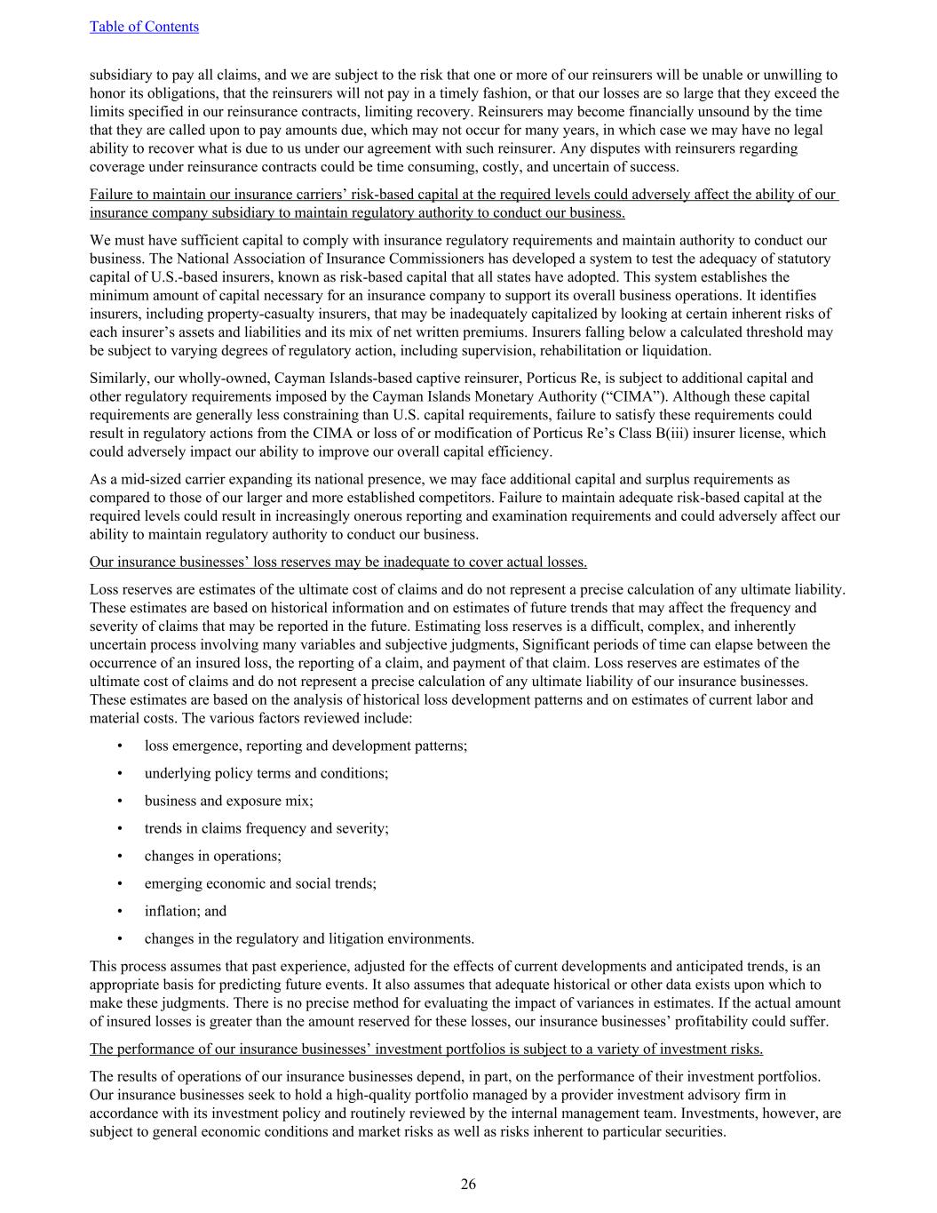 subsidiary to pay all claims, and we are subject to the risk that one or more of our reinsurers will be unable or unwilling to honor its obligations, that the reinsurers will not pay in a timely fashion, or that our losses are so large that they exceed the limits specified in our reinsurance contracts, limiting recovery. Reinsurers may become financially unsound by the time that they are called upon to pay amounts due, which may not occur for many years, in which case we may have no legal ability to recover what is due to us under our agreement with such reinsurer. Any disputes with reinsurers regarding coverage under reinsurance contracts could be time consuming, costly, and uncertain of success. Failure to maintain our insurance carriers’ risk-based capital at the required levels could adversely affect the ability of our insurance company subsidiary to maintain regulatory authority to conduct our business. We must have sufficient capital to comply with insurance regulatory requirements and maintain authority to conduct our business. The National Association of Insurance Commissioners has developed a system to test the adequacy of statutory capital of U.S.-based insurers, known as risk-based capital that all states have adopted. This system establishes the minimum amount of capital necessary for an insurance company to support its overall business operations. It identifies insurers, including property-casualty insurers, that may be inadequately capitalized by looking at certain inherent risks of each insurer’s assets and liabilities and its mix of net written premiums. Insurers falling below a calculated threshold may be subject to varying degrees of regulatory action, including supervision, rehabilitation or liquidation. Similarly, our wholly-owned, Cayman Islands-based captive reinsurer, Porticus Re, is subject to additional capital and other regulatory requirements imposed by the Cayman Islands Monetary Authority (“CIMA”). Although these capital requirements are generally less constraining than U.S. capital requirements, failure to satisfy these requirements could result in regulatory actions from the CIMA or loss of or modification of Porticus Re’s Class B(iii) insurer license, which could adversely impact our ability to improve our overall capital efficiency. As a mid-sized carrier expanding its national presence, we may face additional capital and surplus requirements as compared to those of our larger and more established competitors. Failure to maintain adequate risk-based capital at the required levels could result in increasingly onerous reporting and examination requirements and could adversely affect our ability to maintain regulatory authority to conduct our business. Our insurance businesses’ loss reserves may be inadequate to cover actual losses. Loss reserves are estimates of the ultimate cost of claims and do not represent a precise calculation of any ultimate liability. These estimates are based on historical information and on estimates of future trends that may affect the frequency and severity of claims that may be reported in the future. Estimating loss reserves is a difficult, complex, and inherently uncertain process involving many variables and subjective judgments, Significant periods of time can elapse between the occurrence of an insured loss, the reporting of a claim, and payment of that claim. Loss reserves are estimates of the ultimate cost of claims and do not represent a precise calculation of any ultimate liability of our insurance businesses. These estimates are based on the analysis of historical loss development patterns and on estimates of current labor and material costs. The various factors reviewed include: • loss emergence, reporting and development patterns; • underlying policy terms and conditions; • business and exposure mix; • trends in claims frequency and severity; • changes in operations; • emerging economic and social trends; • inflation; and • changes in the regulatory and litigation environments. This process assumes that past experience, adjusted for the effects of current developments and anticipated trends, is an appropriate basis for predicting future events. It also assumes that adequate historical or other data exists upon which to make these judgments. There is no precise method for evaluating the impact of variances in estimates. If the actual amount of insured losses is greater than the amount reserved for these losses, our insurance businesses’ profitability could suffer. The performance of our insurance businesses’ investment portfolios is subject to a variety of investment risks. The results of operations of our insurance businesses depend, in part, on the performance of their investment portfolios. Our insurance businesses seek to hold a high-quality portfolio managed by a provider investment advisory firm in accordance with its investment policy and routinely reviewed by the internal management team. Investments, however, are subject to general economic conditions and market risks as well as risks inherent to particular securities. Table of Contents 26