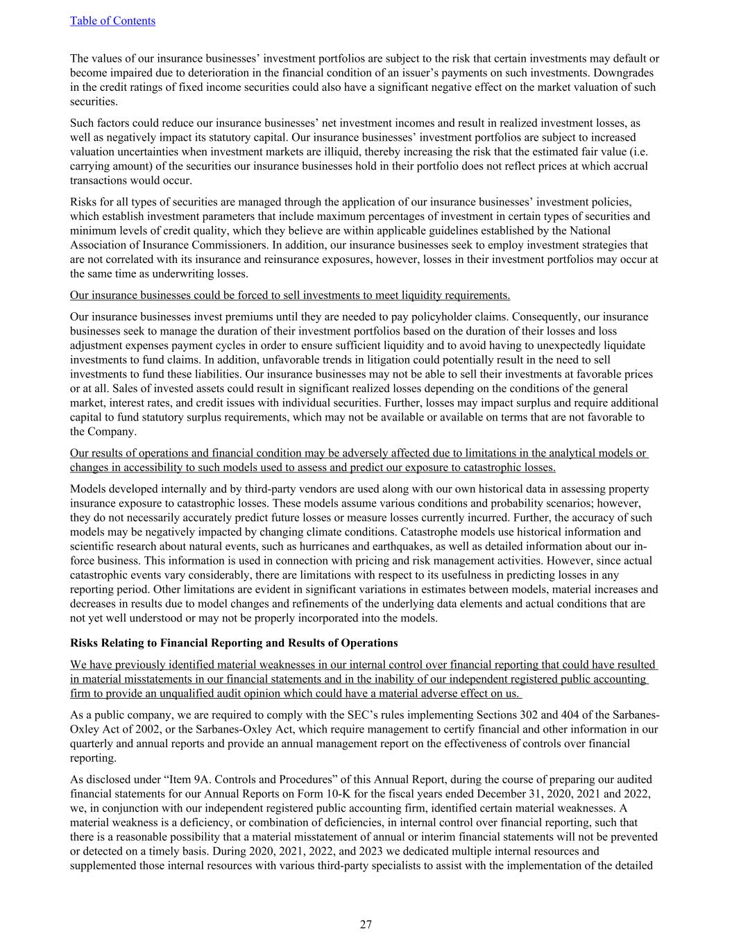The values of our insurance businesses’ investment portfolios are subject to the risk that certain investments may default or become impaired due to deterioration in the financial condition of an issuer’s payments on such investments. Downgrades in the credit ratings of fixed income securities could also have a significant negative effect on the market valuation of such securities. Such factors could reduce our insurance businesses’ net investment incomes and result in realized investment losses, as well as negatively impact its statutory capital. Our insurance businesses’ investment portfolios are subject to increased valuation uncertainties when investment markets are illiquid, thereby increasing the risk that the estimated fair value (i.e. carrying amount) of the securities our insurance businesses hold in their portfolio does not reflect prices at which accrual transactions would occur. Risks for all types of securities are managed through the application of our insurance businesses’ investment policies, which establish investment parameters that include maximum percentages of investment in certain types of securities and minimum levels of credit quality, which they believe are within applicable guidelines established by the National Association of Insurance Commissioners. In addition, our insurance businesses seek to employ investment strategies that are not correlated with its insurance and reinsurance exposures, however, losses in their investment portfolios may occur at the same time as underwriting losses. Our insurance businesses could be forced to sell investments to meet liquidity requirements. Our insurance businesses invest premiums until they are needed to pay policyholder claims. Consequently, our insurance businesses seek to manage the duration of their investment portfolios based on the duration of their losses and loss adjustment expenses payment cycles in order to ensure sufficient liquidity and to avoid having to unexpectedly liquidate investments to fund claims. In addition, unfavorable trends in litigation could potentially result in the need to sell investments to fund these liabilities. Our insurance businesses may not be able to sell their investments at favorable prices or at all. Sales of invested assets could result in significant realized losses depending on the conditions of the general market, interest rates, and credit issues with individual securities. Further, losses may impact surplus and require additional capital to fund statutory surplus requirements, which may not be available or available on terms that are not favorable to the Company. Our results of operations and financial condition may be adversely affected due to limitations in the analytical models or changes in accessibility to such models used to assess and predict our exposure to catastrophic losses. Models developed internally and by third-party vendors are used along with our own historical data in assessing property insurance exposure to catastrophic losses. These models assume various conditions and probability scenarios; however, they do not necessarily accurately predict future losses or measure losses currently incurred. Further, the accuracy of such models may be negatively impacted by changing climate conditions. Catastrophe models use historical information and scientific research about natural events, such as hurricanes and earthquakes, as well as detailed information about our in- force business. This information is used in connection with pricing and risk management activities. However, since actual catastrophic events vary considerably, there are limitations with respect to its usefulness in predicting losses in any reporting period. Other limitations are evident in significant variations in estimates between models, material increases and decreases in results due to model changes and refinements of the underlying data elements and actual conditions that are not yet well understood or may not be properly incorporated into the models. Risks Relating to Financial Reporting and Results of Operations We have previously identified material weaknesses in our internal control over financial reporting that could have resulted in material misstatements in our financial statements and in the inability of our independent registered public accounting firm to provide an unqualified audit opinion which could have a material adverse effect on us. As a public company, we are required to comply with the SEC’s rules implementing Sections 302 and 404 of the Sarbanes- Oxley Act of 2002, or the Sarbanes-Oxley Act, which require management to certify financial and other information in our quarterly and annual reports and provide an annual management report on the effectiveness of controls over financial reporting. As disclosed under “Item 9A. Controls and Procedures” of this Annual Report, during the course of preparing our audited financial statements for our Annual Reports on Form 10-K for the fiscal years ended December 31, 2020, 2021 and 2022, we, in conjunction with our independent registered public accounting firm, identified certain material weaknesses. A material weakness is a deficiency, or combination of deficiencies, in internal control over financial reporting, such that there is a reasonable possibility that a material misstatement of annual or interim financial statements will not be prevented or detected on a timely basis. During 2020, 2021, 2022, and 2023 we dedicated multiple internal resources and supplemented those internal resources with various third-party specialists to assist with the implementation of the detailed Table of Contents 27