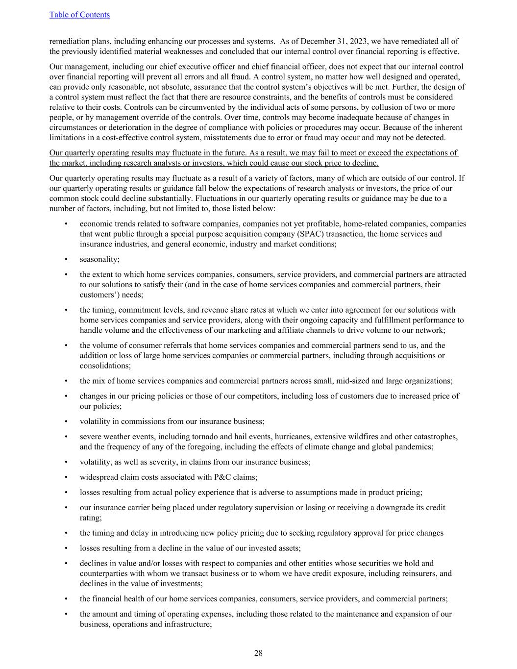 remediation plans, including enhancing our processes and systems. As of December 31, 2023, we have remediated all of the previously identified material weaknesses and concluded that our internal control over financial reporting is effective. Our management, including our chief executive officer and chief financial officer, does not expect that our internal control over financial reporting will prevent all errors and all fraud. A control system, no matter how well designed and operated, can provide only reasonable, not absolute, assurance that the control system’s objectives will be met. Further, the design of a control system must reflect the fact that there are resource constraints, and the benefits of controls must be considered relative to their costs. Controls can be circumvented by the individual acts of some persons, by collusion of two or more people, or by management override of the controls. Over time, controls may become inadequate because of changes in circumstances or deterioration in the degree of compliance with policies or procedures may occur. Because of the inherent limitations in a cost-effective control system, misstatements due to error or fraud may occur and may not be detected. Our quarterly operating results may fluctuate in the future. As a result, we may fail to meet or exceed the expectations of the market, including research analysts or investors, which could cause our stock price to decline. Our quarterly operating results may fluctuate as a result of a variety of factors, many of which are outside of our control. If our quarterly operating results or guidance fall below the expectations of research analysts or investors, the price of our common stock could decline substantially. Fluctuations in our quarterly operating results or guidance may be due to a number of factors, including, but not limited to, those listed below: • economic trends related to software companies, companies not yet profitable, home-related companies, companies that went public through a special purpose acquisition company (SPAC) transaction, the home services and insurance industries, and general economic, industry and market conditions; • seasonality; • the extent to which home services companies, consumers, service providers, and commercial partners are attracted to our solutions to satisfy their (and in the case of home services companies and commercial partners, their customers’) needs; • the timing, commitment levels, and revenue share rates at which we enter into agreement for our solutions with home services companies and service providers, along with their ongoing capacity and fulfillment performance to handle volume and the effectiveness of our marketing and affiliate channels to drive volume to our network; • the volume of consumer referrals that home services companies and commercial partners send to us, and the addition or loss of large home services companies or commercial partners, including through acquisitions or consolidations; • the mix of home services companies and commercial partners across small, mid-sized and large organizations; • changes in our pricing policies or those of our competitors, including loss of customers due to increased price of our policies; • volatility in commissions from our insurance business; • severe weather events, including tornado and hail events, hurricanes, extensive wildfires and other catastrophes, and the frequency of any of the foregoing, including the effects of climate change and global pandemics; • volatility, as well as severity, in claims from our insurance business; • widespread claim costs associated with P&C claims; • losses resulting from actual policy experience that is adverse to assumptions made in product pricing; • our insurance carrier being placed under regulatory supervision or losing or receiving a downgrade its credit rating; • the timing and delay in introducing new policy pricing due to seeking regulatory approval for price changes • losses resulting from a decline in the value of our invested assets; • declines in value and/or losses with respect to companies and other entities whose securities we hold and counterparties with whom we transact business or to whom we have credit exposure, including reinsurers, and declines in the value of investments; • the financial health of our home services companies, consumers, service providers, and commercial partners; • the amount and timing of operating expenses, including those related to the maintenance and expansion of our business, operations and infrastructure; Table of Contents 28