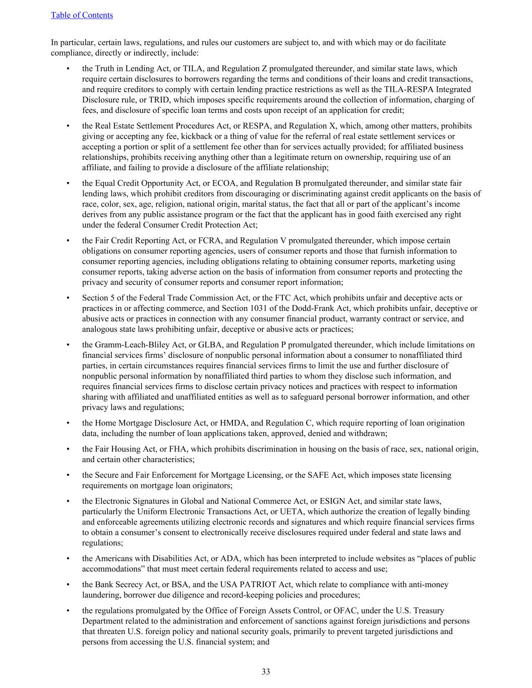 In particular, certain laws, regulations, and rules our customers are subject to, and with which may or do facilitate compliance, directly or indirectly, include: • the Truth in Lending Act, or TILA, and Regulation Z promulgated thereunder, and similar state laws, which require certain disclosures to borrowers regarding the terms and conditions of their loans and credit transactions, and require creditors to comply with certain lending practice restrictions as well as the TILA-RESPA Integrated Disclosure rule, or TRID, which imposes specific requirements around the collection of information, charging of fees, and disclosure of specific loan terms and costs upon receipt of an application for credit; • the Real Estate Settlement Procedures Act, or RESPA, and Regulation X, which, among other matters, prohibits giving or accepting any fee, kickback or a thing of value for the referral of real estate settlement services or accepting a portion or split of a settlement fee other than for services actually provided; for affiliated business relationships, prohibits receiving anything other than a legitimate return on ownership, requiring use of an affiliate, and failing to provide a disclosure of the affiliate relationship; • the Equal Credit Opportunity Act, or ECOA, and Regulation B promulgated thereunder, and similar state fair lending laws, which prohibit creditors from discouraging or discriminating against credit applicants on the basis of race, color, sex, age, religion, national origin, marital status, the fact that all or part of the applicant’s income derives from any public assistance program or the fact that the applicant has in good faith exercised any right under the federal Consumer Credit Protection Act; • the Fair Credit Reporting Act, or FCRA, and Regulation V promulgated thereunder, which impose certain obligations on consumer reporting agencies, users of consumer reports and those that furnish information to consumer reporting agencies, including obligations relating to obtaining consumer reports, marketing using consumer reports, taking adverse action on the basis of information from consumer reports and protecting the privacy and security of consumer reports and consumer report information; • Section 5 of the Federal Trade Commission Act, or the FTC Act, which prohibits unfair and deceptive acts or practices in or affecting commerce, and Section 1031 of the Dodd-Frank Act, which prohibits unfair, deceptive or abusive acts or practices in connection with any consumer financial product, warranty contract or service, and analogous state laws prohibiting unfair, deceptive or abusive acts or practices; • the Gramm-Leach-Bliley Act, or GLBA, and Regulation P promulgated thereunder, which include limitations on financial services firms’ disclosure of nonpublic personal information about a consumer to nonaffiliated third parties, in certain circumstances requires financial services firms to limit the use and further disclosure of nonpublic personal information by nonaffiliated third parties to whom they disclose such information, and requires financial services firms to disclose certain privacy notices and practices with respect to information sharing with affiliated and unaffiliated entities as well as to safeguard personal borrower information, and other privacy laws and regulations; • the Home Mortgage Disclosure Act, or HMDA, and Regulation C, which require reporting of loan origination data, including the number of loan applications taken, approved, denied and withdrawn; • the Fair Housing Act, or FHA, which prohibits discrimination in housing on the basis of race, sex, national origin, and certain other characteristics; • the Secure and Fair Enforcement for Mortgage Licensing, or the SAFE Act, which imposes state licensing requirements on mortgage loan originators; • the Electronic Signatures in Global and National Commerce Act, or ESIGN Act, and similar state laws, particularly the Uniform Electronic Transactions Act, or UETA, which authorize the creation of legally binding and enforceable agreements utilizing electronic records and signatures and which require financial services firms to obtain a consumer’s consent to electronically receive disclosures required under federal and state laws and regulations; • the Americans with Disabilities Act, or ADA, which has been interpreted to include websites as “places of public accommodations” that must meet certain federal requirements related to access and use; • the Bank Secrecy Act, or BSA, and the USA PATRIOT Act, which relate to compliance with anti-money laundering, borrower due diligence and record-keeping policies and procedures; • the regulations promulgated by the Office of Foreign Assets Control, or OFAC, under the U.S. Treasury Department related to the administration and enforcement of sanctions against foreign jurisdictions and persons that threaten U.S. foreign policy and national security goals, primarily to prevent targeted jurisdictions and persons from accessing the U.S. financial system; and Table of Contents 33