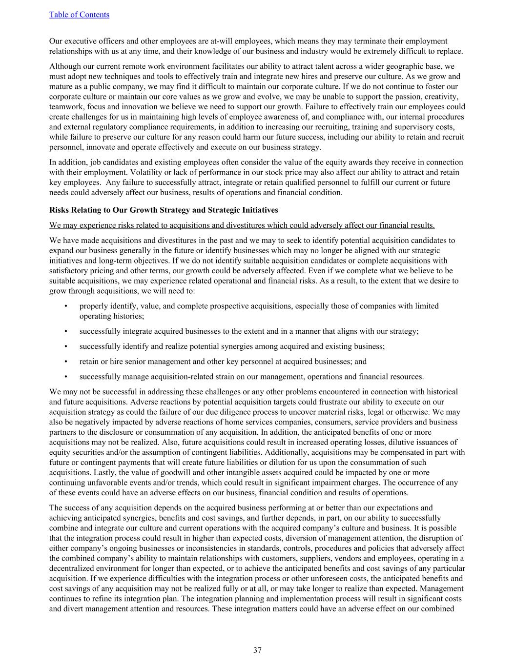 Our executive officers and other employees are at-will employees, which means they may terminate their employment relationships with us at any time, and their knowledge of our business and industry would be extremely difficult to replace. Although our current remote work environment facilitates our ability to attract talent across a wider geographic base, we must adopt new techniques and tools to effectively train and integrate new hires and preserve our culture. As we grow and mature as a public company, we may find it difficult to maintain our corporate culture. If we do not continue to foster our corporate culture or maintain our core values as we grow and evolve, we may be unable to support the passion, creativity, teamwork, focus and innovation we believe we need to support our growth. Failure to effectively train our employees could create challenges for us in maintaining high levels of employee awareness of, and compliance with, our internal procedures and external regulatory compliance requirements, in addition to increasing our recruiting, training and supervisory costs, while failure to preserve our culture for any reason could harm our future success, including our ability to retain and recruit personnel, innovate and operate effectively and execute on our business strategy. In addition, job candidates and existing employees often consider the value of the equity awards they receive in connection with their employment. Volatility or lack of performance in our stock price may also affect our ability to attract and retain key employees. Any failure to successfully attract, integrate or retain qualified personnel to fulfill our current or future needs could adversely affect our business, results of operations and financial condition. Risks Relating to Our Growth Strategy and Strategic Initiatives We may experience risks related to acquisitions and divestitures which could adversely affect our financial results. We have made acquisitions and divestitures in the past and we may to seek to identify potential acquisition candidates to expand our business generally in the future or identify businesses which may no longer be aligned with our strategic initiatives and long-term objectives. If we do not identify suitable acquisition candidates or complete acquisitions with satisfactory pricing and other terms, our growth could be adversely affected. Even if we complete what we believe to be suitable acquisitions, we may experience related operational and financial risks. As a result, to the extent that we desire to grow through acquisitions, we will need to: • properly identify, value, and complete prospective acquisitions, especially those of companies with limited operating histories; • successfully integrate acquired businesses to the extent and in a manner that aligns with our strategy; • successfully identify and realize potential synergies among acquired and existing business; • retain or hire senior management and other key personnel at acquired businesses; and • successfully manage acquisition-related strain on our management, operations and financial resources. We may not be successful in addressing these challenges or any other problems encountered in connection with historical and future acquisitions. Adverse reactions by potential acquisition targets could frustrate our ability to execute on our acquisition strategy as could the failure of our due diligence process to uncover material risks, legal or otherwise. We may also be negatively impacted by adverse reactions of home services companies, consumers, service providers and business partners to the disclosure or consummation of any acquisition. In addition, the anticipated benefits of one or more acquisitions may not be realized. Also, future acquisitions could result in increased operating losses, dilutive issuances of equity securities and/or the assumption of contingent liabilities. Additionally, acquisitions may be compensated in part with future or contingent payments that will create future liabilities or dilution for us upon the consummation of such acquisitions. Lastly, the value of goodwill and other intangible assets acquired could be impacted by one or more continuing unfavorable events and/or trends, which could result in significant impairment charges. The occurrence of any of these events could have an adverse effects on our business, financial condition and results of operations. The success of any acquisition depends on the acquired business performing at or better than our expectations and achieving anticipated synergies, benefits and cost savings, and further depends, in part, on our ability to successfully combine and integrate our culture and current operations with the acquired company’s culture and business. It is possible that the integration process could result in higher than expected costs, diversion of management attention, the disruption of either company’s ongoing businesses or inconsistencies in standards, controls, procedures and policies that adversely affect the combined company’s ability to maintain relationships with customers, suppliers, vendors and employees, operating in a decentralized environment for longer than expected, or to achieve the anticipated benefits and cost savings of any particular acquisition. If we experience difficulties with the integration process or other unforeseen costs, the anticipated benefits and cost savings of any acquisition may not be realized fully or at all, or may take longer to realize than expected. Management continues to refine its integration plan. The integration planning and implementation process will result in significant costs and divert management attention and resources. These integration matters could have an adverse effect on our combined Table of Contents 37