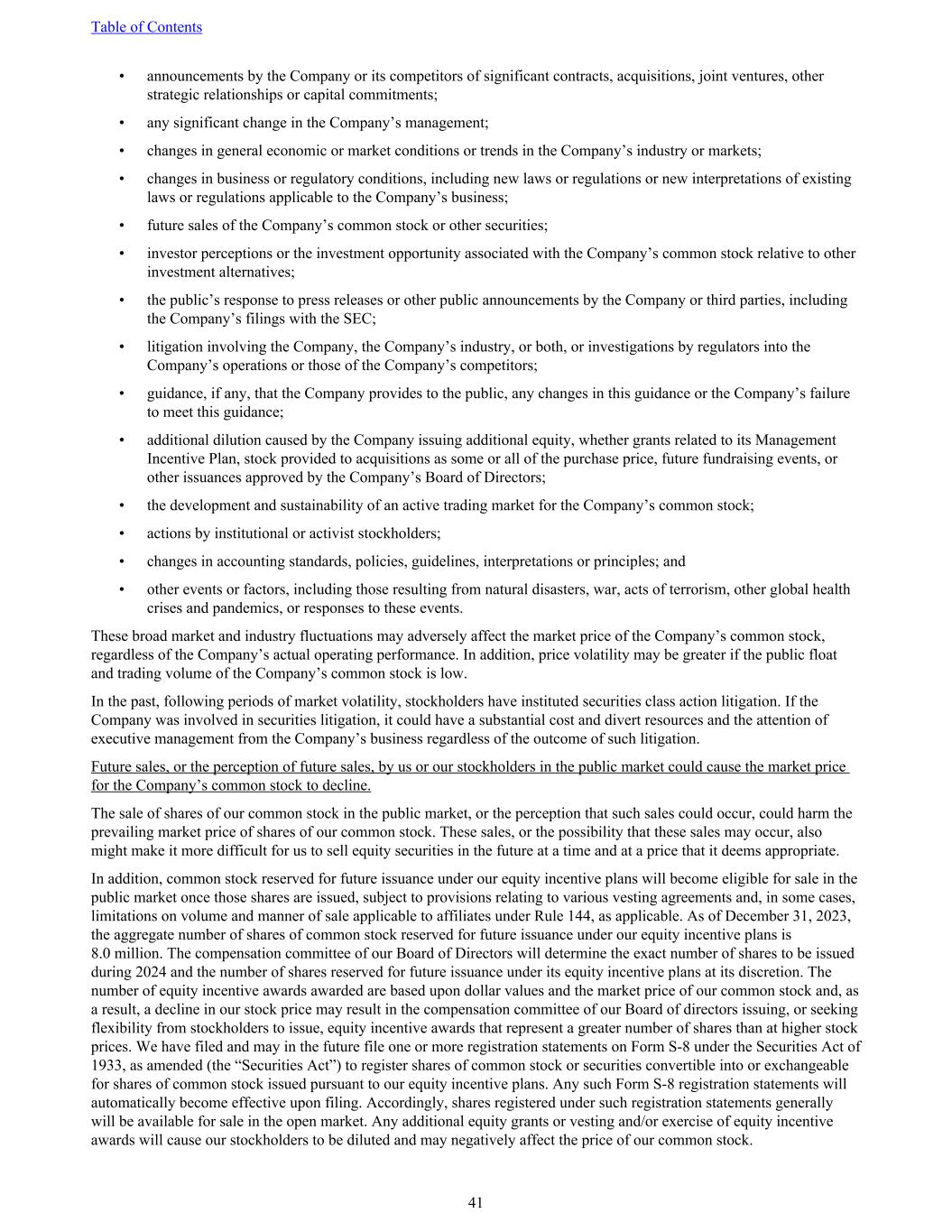 • announcements by the Company or its competitors of significant contracts, acquisitions, joint ventures, other strategic relationships or capital commitments; • any significant change in the Company’s management; • changes in general economic or market conditions or trends in the Company’s industry or markets; • changes in business or regulatory conditions, including new laws or regulations or new interpretations of existing laws or regulations applicable to the Company’s business; • future sales of the Company’s common stock or other securities; • investor perceptions or the investment opportunity associated with the Company’s common stock relative to other investment alternatives; • the public’s response to press releases or other public announcements by the Company or third parties, including the Company’s filings with the SEC; • litigation involving the Company, the Company’s industry, or both, or investigations by regulators into the Company’s operations or those of the Company’s competitors; • guidance, if any, that the Company provides to the public, any changes in this guidance or the Company’s failure to meet this guidance; • additional dilution caused by the Company issuing additional equity, whether grants related to its Management Incentive Plan, stock provided to acquisitions as some or all of the purchase price, future fundraising events, or other issuances approved by the Company’s Board of Directors; • the development and sustainability of an active trading market for the Company’s common stock; • actions by institutional or activist stockholders; • changes in accounting standards, policies, guidelines, interpretations or principles; and • other events or factors, including those resulting from natural disasters, war, acts of terrorism, other global health crises and pandemics, or responses to these events. These broad market and industry fluctuations may adversely affect the market price of the Company’s common stock, regardless of the Company’s actual operating performance. In addition, price volatility may be greater if the public float and trading volume of the Company’s common stock is low. In the past, following periods of market volatility, stockholders have instituted securities class action litigation. If the Company was involved in securities litigation, it could have a substantial cost and divert resources and the attention of executive management from the Company’s business regardless of the outcome of such litigation. Future sales, or the perception of future sales, by us or our stockholders in the public market could cause the market price for the Company’s common stock to decline. The sale of shares of our common stock in the public market, or the perception that such sales could occur, could harm the prevailing market price of shares of our common stock. These sales, or the possibility that these sales may occur, also might make it more difficult for us to sell equity securities in the future at a time and at a price that it deems appropriate. In addition, common stock reserved for future issuance under our equity incentive plans will become eligible for sale in the public market once those shares are issued, subject to provisions relating to various vesting agreements and, in some cases, limitations on volume and manner of sale applicable to affiliates under Rule 144, as applicable. As of December 31, 2023, the aggregate number of shares of common stock reserved for future issuance under our equity incentive plans is 8.0 million. The compensation committee of our Board of Directors will determine the exact number of shares to be issued during 2024 and the number of shares reserved for future issuance under its equity incentive plans at its discretion. The number of equity incentive awards awarded are based upon dollar values and the market price of our common stock and, as a result, a decline in our stock price may result in the compensation committee of our Board of directors issuing, or seeking flexibility from stockholders to issue, equity incentive awards that represent a greater number of shares than at higher stock prices. We have filed and may in the future file one or more registration statements on Form S-8 under the Securities Act of 1933, as amended (the “Securities Act”) to register shares of common stock or securities convertible into or exchangeable for shares of common stock issued pursuant to our equity incentive plans. Any such Form S-8 registration statements will automatically become effective upon filing. Accordingly, shares registered under such registration statements generally will be available for sale in the open market. Any additional equity grants or vesting and/or exercise of equity incentive awards will cause our stockholders to be diluted and may negatively affect the price of our common stock. Table of Contents 41