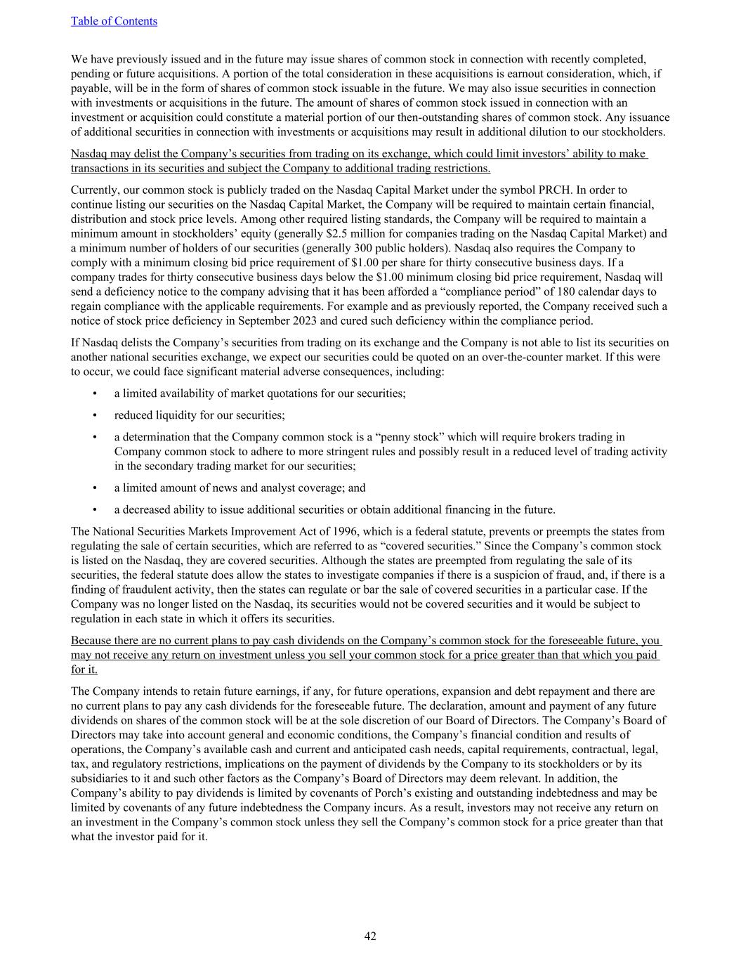 We have previously issued and in the future may issue shares of common stock in connection with recently completed, pending or future acquisitions. A portion of the total consideration in these acquisitions is earnout consideration, which, if payable, will be in the form of shares of common stock issuable in the future. We may also issue securities in connection with investments or acquisitions in the future. The amount of shares of common stock issued in connection with an investment or acquisition could constitute a material portion of our then-outstanding shares of common stock. Any issuance of additional securities in connection with investments or acquisitions may result in additional dilution to our stockholders. Nasdaq may delist the Company’s securities from trading on its exchange, which could limit investors’ ability to make transactions in its securities and subject the Company to additional trading restrictions. Currently, our common stock is publicly traded on the Nasdaq Capital Market under the symbol PRCH. In order to continue listing our securities on the Nasdaq Capital Market, the Company will be required to maintain certain financial, distribution and stock price levels. Among other required listing standards, the Company will be required to maintain a minimum amount in stockholders’ equity (generally $2.5 million for companies trading on the Nasdaq Capital Market) and a minimum number of holders of our securities (generally 300 public holders). Nasdaq also requires the Company to comply with a minimum closing bid price requirement of $1.00 per share for thirty consecutive business days. If a company trades for thirty consecutive business days below the $1.00 minimum closing bid price requirement, Nasdaq will send a deficiency notice to the company advising that it has been afforded a “compliance period” of 180 calendar days to regain compliance with the applicable requirements. For example and as previously reported, the Company received such a notice of stock price deficiency in September 2023 and cured such deficiency within the compliance period. If Nasdaq delists the Company’s securities from trading on its exchange and the Company is not able to list its securities on another national securities exchange, we expect our securities could be quoted on an over-the-counter market. If this were to occur, we could face significant material adverse consequences, including: • a limited availability of market quotations for our securities; • reduced liquidity for our securities; • a determination that the Company common stock is a “penny stock” which will require brokers trading in Company common stock to adhere to more stringent rules and possibly result in a reduced level of trading activity in the secondary trading market for our securities; • a limited amount of news and analyst coverage; and • a decreased ability to issue additional securities or obtain additional financing in the future. The National Securities Markets Improvement Act of 1996, which is a federal statute, prevents or preempts the states from regulating the sale of certain securities, which are referred to as “covered securities.” Since the Company’s common stock is listed on the Nasdaq, they are covered securities. Although the states are preempted from regulating the sale of its securities, the federal statute does allow the states to investigate companies if there is a suspicion of fraud, and, if there is a finding of fraudulent activity, then the states can regulate or bar the sale of covered securities in a particular case. If the Company was no longer listed on the Nasdaq, its securities would not be covered securities and it would be subject to regulation in each state in which it offers its securities. Because there are no current plans to pay cash dividends on the Company’s common stock for the foreseeable future, you may not receive any return on investment unless you sell your common stock for a price greater than that which you paid for it. The Company intends to retain future earnings, if any, for future operations, expansion and debt repayment and there are no current plans to pay any cash dividends for the foreseeable future. The declaration, amount and payment of any future dividends on shares of the common stock will be at the sole discretion of our Board of Directors. The Company’s Board of Directors may take into account general and economic conditions, the Company’s financial condition and results of operations, the Company’s available cash and current and anticipated cash needs, capital requirements, contractual, legal, tax, and regulatory restrictions, implications on the payment of dividends by the Company to its stockholders or by its subsidiaries to it and such other factors as the Company’s Board of Directors may deem relevant. In addition, the Company’s ability to pay dividends is limited by covenants of Porch’s existing and outstanding indebtedness and may be limited by covenants of any future indebtedness the Company incurs. As a result, investors may not receive any return on an investment in the Company’s common stock unless they sell the Company’s common stock for a price greater than that what the investor paid for it. Table of Contents 42